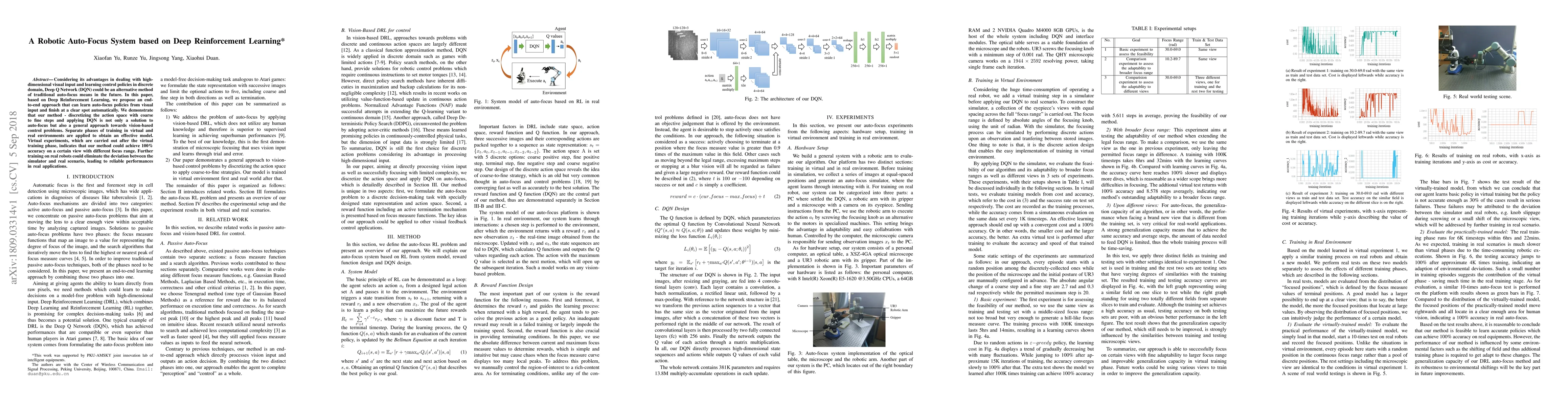 This paper proposes an auto-focus system using Deep Reinforcement Learning, specifically Deep Q Network (DQN), to achieve clear focus automatically from visual input. The method, which involves discretizing the action space and training in both virtual and real environments, demonstrates 100% accuracy in virtual tests and aims to bridge the gap between simulation and real-world performance.