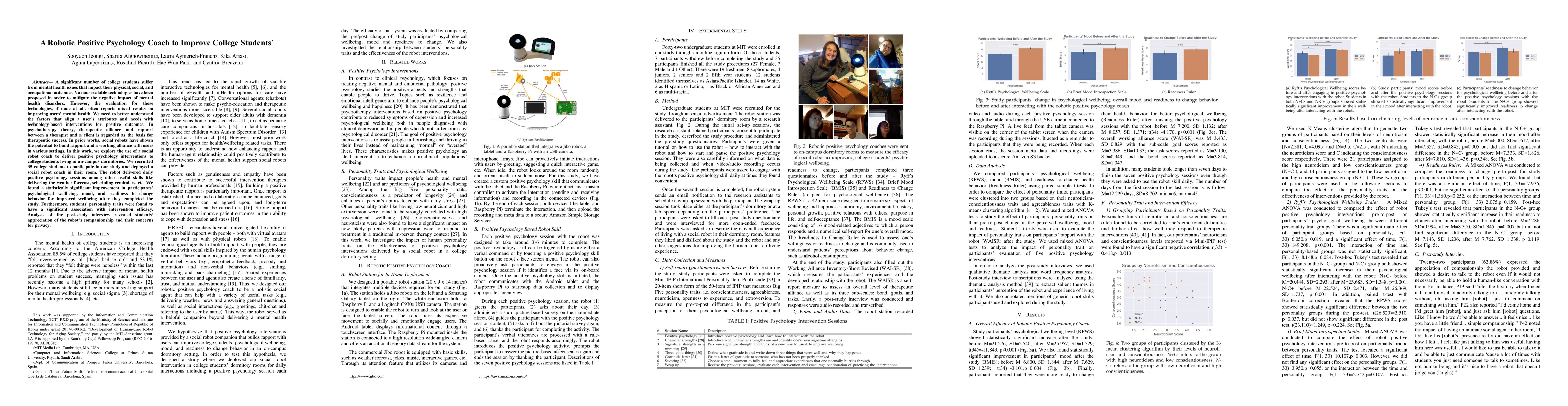 This study investigates a social robot coach delivering positive psychology interventions to improve college students' wellbeing, finding significant improvements in psychological wellbeing, mood, and behavior change. Students' personality traits significantly influenced intervention efficacy, and while they appreciated the robot's companionship, privacy concerns were noted.