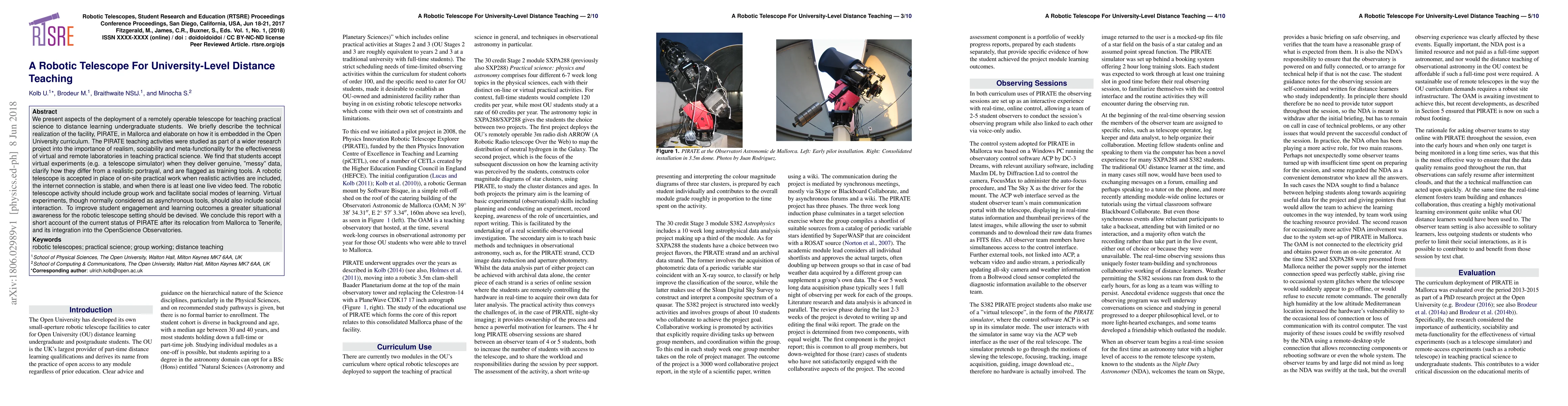 We present aspects of the deployment of a remotely operable telescope for teaching practical science to distance learning undergraduate students. We briefly describe the technical realization of the facility, PIRATE, in Mallorca and elaborate on how it is embedded in the Open University curriculum. The PIRATE teaching activities were studied as part of a wider research project into the importance of realism, sociability and meta-functionality for the effectiveness of virtual and remote laboratories in teaching practical science. We find that students accept virtual experiments (e.g. a telescope simulator) when they deliver genuine, 'messy' data, clarify how they differ from a realistic portrayal, and are flagged as training tools. A robotic telescope is accepted in place of on-site practical work when realistic activities are included, the internet connection is stable, and when there is at least one live video feed. The robotic telescope activity should include group work and facilitate social modes of learning. Virtual experiments, though normally considered as asynchronous tools, should also include social interaction. To improve student engagement and learning outcomes a greater situational awareness for the robotic telescope setting should be devised. We conclude this report with a short account of the current status of PIRATE after its relocation from Mallorca to Tenerife, and its integration into the OpenScience Observatories.