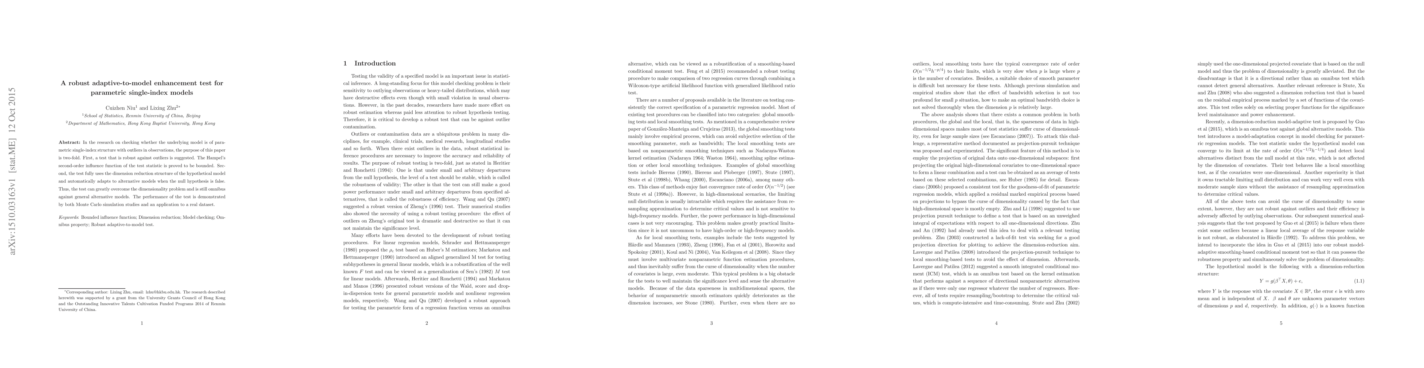 This paper introduces a robust test for parametric single-index models that adapts to alternative models when the null hypothesis is false, overcoming dimensionality issues. The test's performance is demonstrated through Monte Carlo simulation studies and an application to a real dataset.
