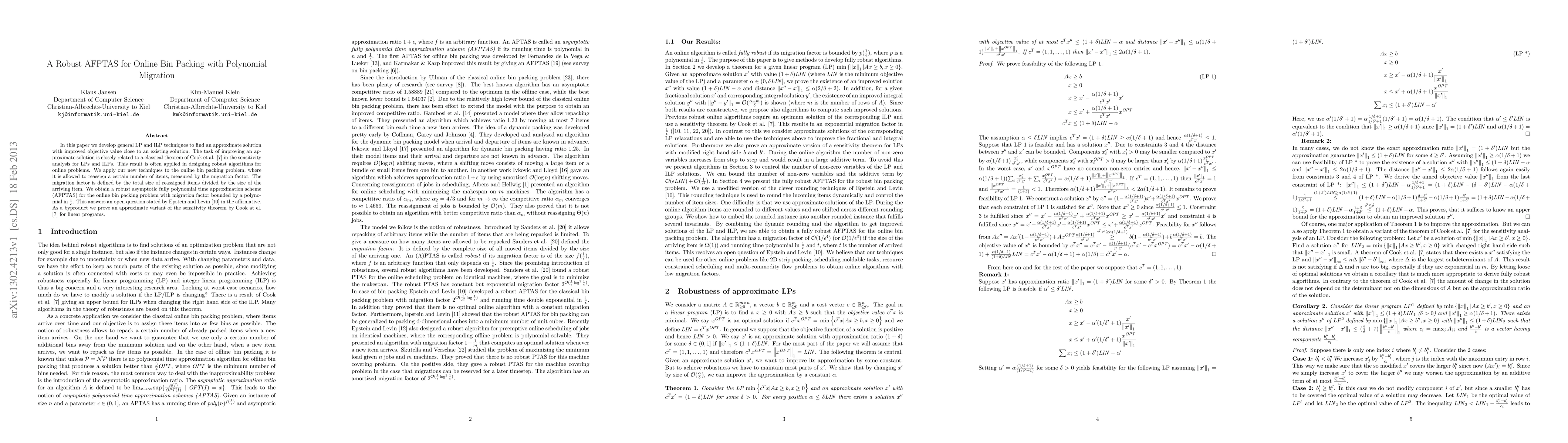 In this paper we develop general LP and ILP techniques to find an approximate solution with improved objective value close to an existing solution. The task of improving an approximate solution is closely related to a classical theorem of Cook et al. in the sensitivity analysis for LPs and ILPs. This result is often applied in designing robust algorithms for online problems. We apply our new techniques to the online bin packing problem, where it is allowed to reassign a certain number of items, measured by the migration factor. The migration factor is defined by the total size of reassigned items divided by the size of the arriving item. We obtain a robust asymptotic fully polynomial time approximation scheme (AFPTAS) for the online bin packing problem with migration factor bounded by a polynomial in $\frac{1}{\epsilon}$. This answers an open question stated by Epstein and Levin in the affirmative. As a byproduct we prove an approximate variant of the sensitivity theorem by Cook at el. for linear programs.