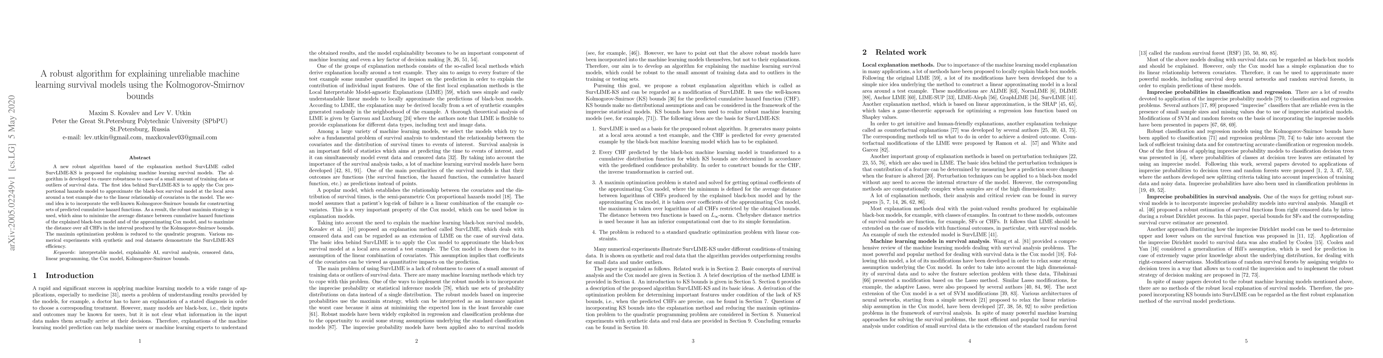This paper proposes SurvLIME-KS, a robust algorithm for explaining unreliable machine learning survival models, which uses the Kolmogorov-Smirnov bounds to handle small training data or outliers. It combines the Cox proportional hazards model with the maximin strategy to optimize the distance between cumulative hazard functions, demonstrating efficiency through numerical experiments.