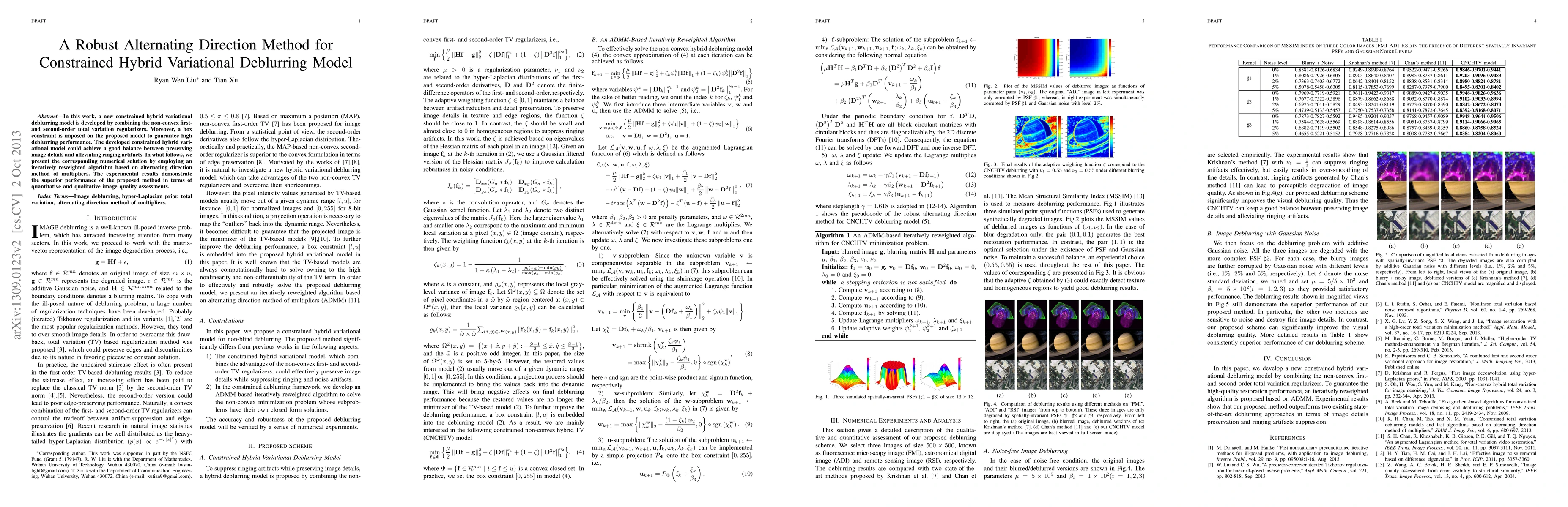 This paper introduces a constrained hybrid variational deblurring model that combines non-convex first- and second-order total variation regularizers, along with a box constraint, to balance detail preservation and artifact reduction. The method employs an alternating direction method of multipliers for numerical solution, showing superior performance in both quantitative and qualitative image quality assessments.