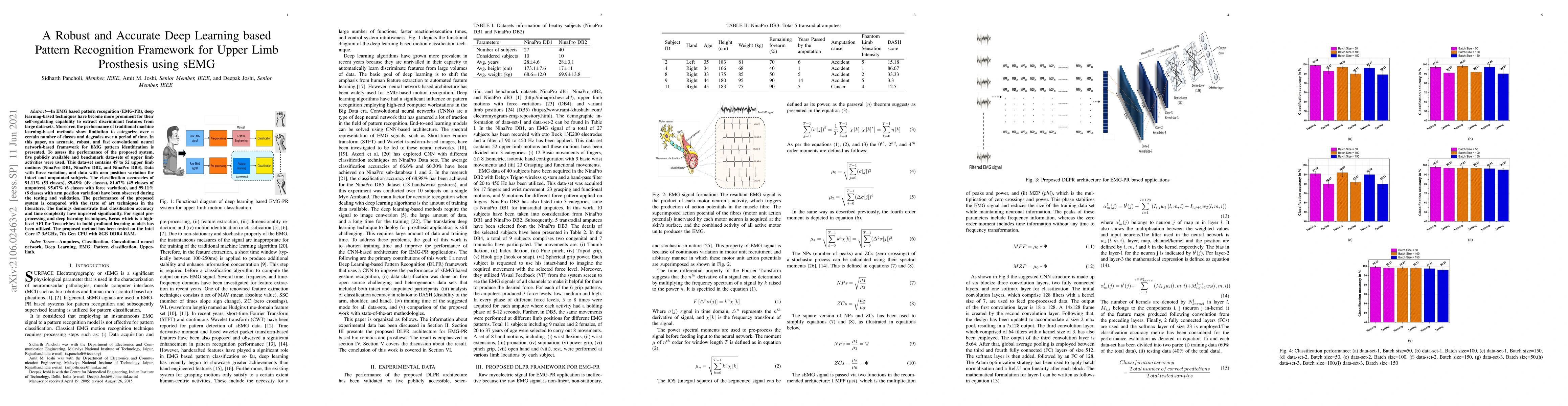A deep learning-based framework for upper limb prosthesis using sEMG achieves high accuracy rates of up to 99.11% in recognizing different arm motions.