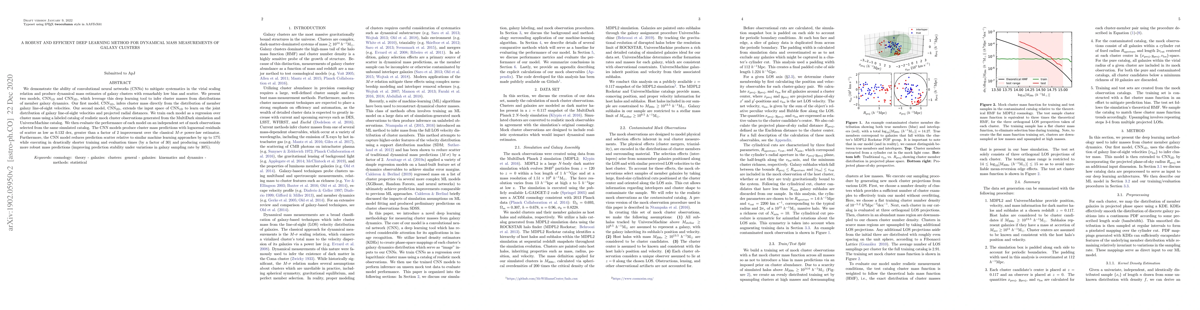 This paper presents convolutional neural networks (CNNs) that significantly improve the accuracy and efficiency of dynamical mass measurements for galaxy clusters. The CNN$_\mathrm{1D}$ and CNN$_\mathrm{2D}$ models achieve low bias and scatter in mass estimates, outperforming traditional methods by a factor of 2 and reducing prediction scatter by up to 17%.