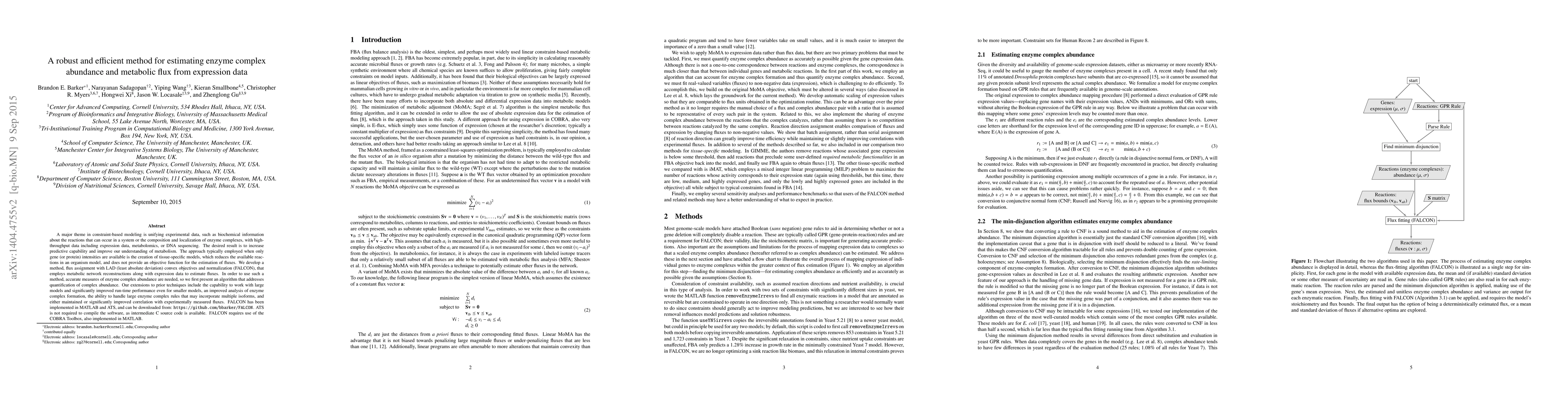 A major theme in constraint-based modeling is unifying experimental data, such as biochemical information about the reactions that can occur in a system or the composition and localization of enzyme complexes, with highthroughput data including expression data, metabolomics, or DNA sequencing. The desired result is to increase predictive capability resulting in improved understanding of metabolism. The approach typically employed when only gene (or protein) intensities are available is the creation of tissue-specific models, which reduces the available reactions in an organism model, and does not provide an objective function for the estimation of fluxes, which is an important limitation in many modeling applications. We develop a method, flux assignment with LAD (least absolute deviation) convex objectives and normalization (FALCON), that employs metabolic network reconstructions along with expression data to estimate fluxes. In order to use such a method, accurate measures of enzyme complex abundance are needed, so we first present a new algorithm that addresses quantification of complex abundance. Our extensions to prior techniques include the capability to work with large models and significantly improved run-time performance even for smaller models, an improved analysis of enzyme complex formation logic, the ability to handle very large enzyme complex rules that may incorporate multiple isoforms, and depending on the model constraints, either maintained or significantly improved correlation with experimentally measured fluxes. FALCON has been implemented in MATLAB and ATS, and can be downloaded from: https://github.com/bbarker/FALCON. ATS is not required to compile the software, as intermediate C source code is available, and binaries are provided for Linux x86-64 systems. FALCON requires use of the COBRA Toolbox, also implemented in MATLAB.
