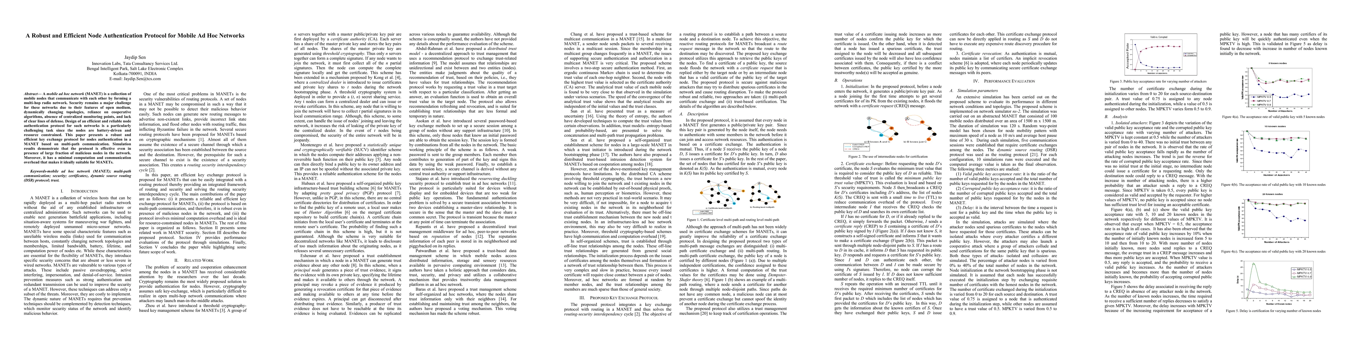 This paper proposes a robust and efficient node authentication protocol for mobile ad hoc networks (MANETs) based on multi-path key exchange, addressing the security challenges posed by the network's dynamic topology and resource constraints. Simulation results show the protocol's effectiveness against malicious nodes with minimal overhead.