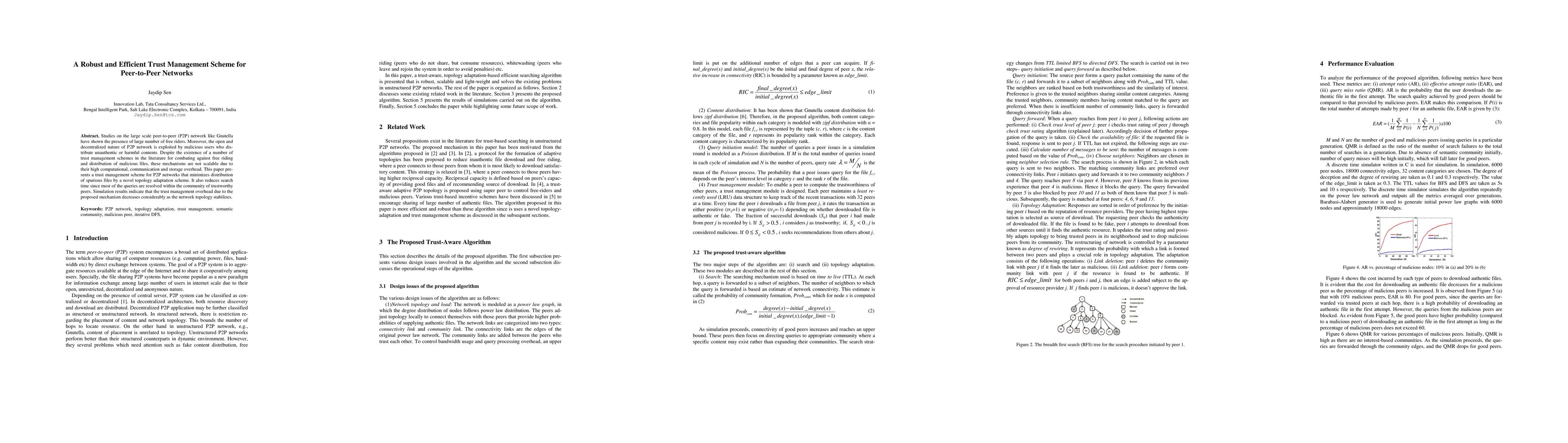This paper proposes a scalable trust management scheme for P2P networks that employs topology adaptation to minimize spurious file distribution and reduce search time by prioritizing trustworthy peers, demonstrating significant reduction in trust management overhead and robustness against malicious users.