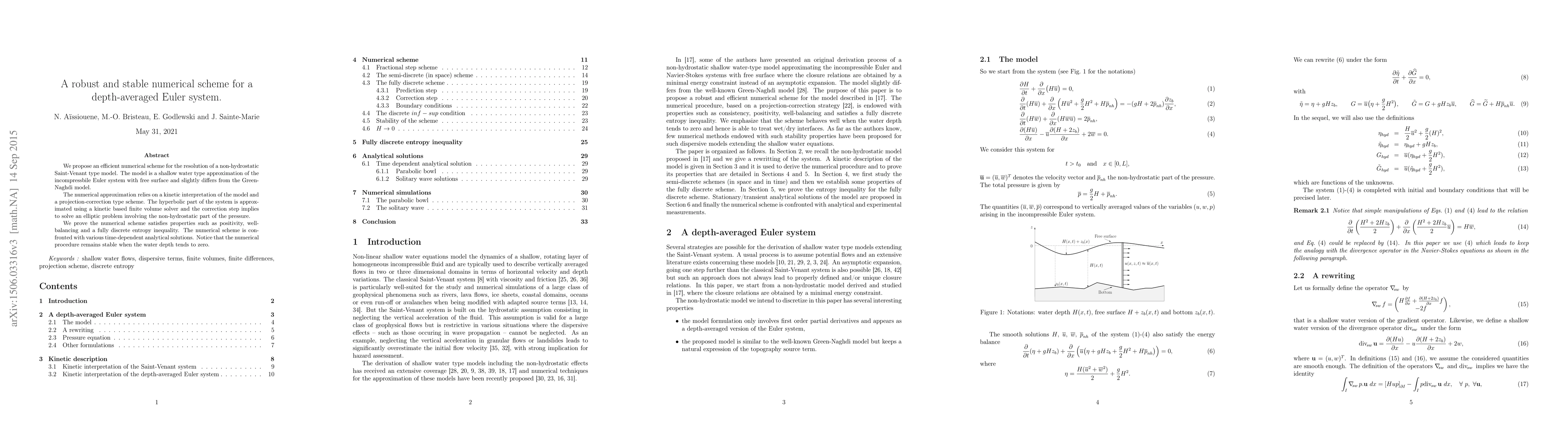 This paper proposes a robust numerical scheme for solving a non-hydrostatic Saint-Venant model, which approximates the incompressible Euler system for shallow water with a free surface. The scheme combines kinetic interpretation and projection-correction methods, ensuring positivity, well-balancing, and entropy inequality, while remaining stable even at zero water depth.