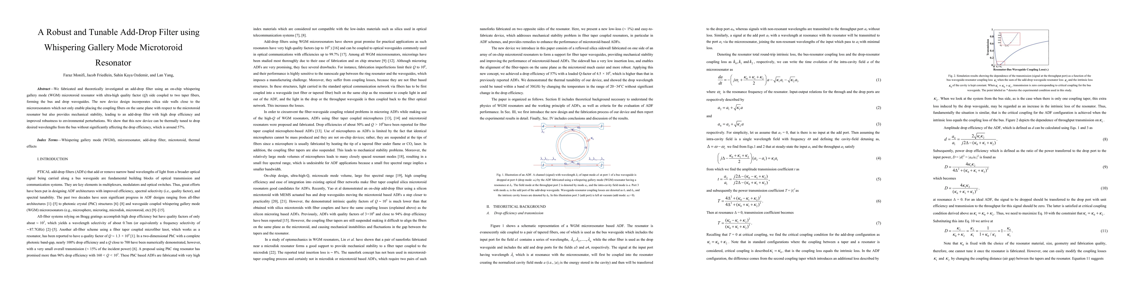 This paper presents a highly efficient and tunable add-drop filter using a whispering gallery mode microtoroid resonator, achieving high drop efficiency and robustness through silica side walls and thermal tuning. The device demonstrates an impressive drop efficiency of approximately 57%.