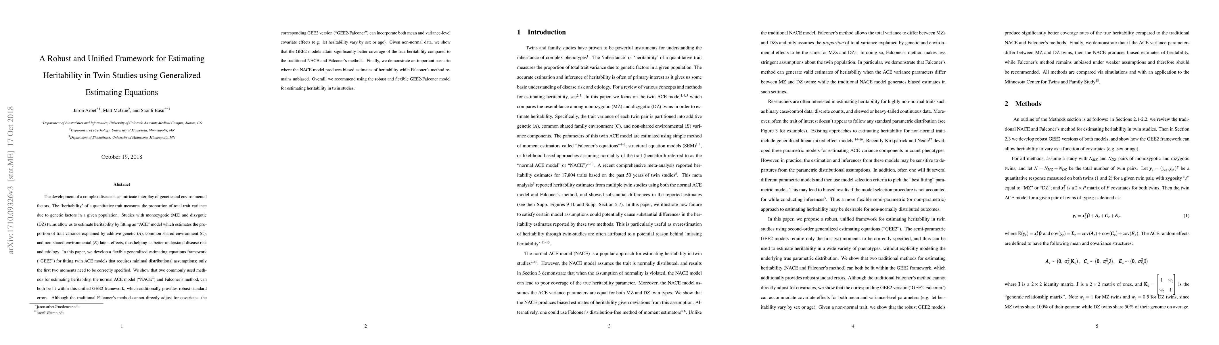 The development of a complex disease is an intricate interplay of genetic and environmental factors. "Heritability" is defined as the proportion of total trait variance due to genetic factors within a given population. Studies with monozygotic (MZ) and dizygotic (DZ) twins allow us to estimate heritability by fitting an "ACE" model which estimates the proportion of trait variance explained by additive genetic (A), common shared environment (C), and unique non-shared environmental (E) latent effects, thus helping us better understand disease risk and etiology. In this paper, we develop a flexible generalized estimating equations framework ("GEE2") for fitting twin ACE models that requires minimal distributional assumptions, rather only the first two moments need to be correctly specified. We prove that two commonly used methods for estimating heritability, the normal ACE model ("NACE") and Falconer's method, can both be fit within this unified GEE2 framework, which additionally provides robust standard errors. Although the traditional Falconer's method cannot directly adjust for covariates, we show that the corresponding GEE2 version ("GEE2-Falconer") can incorporate covariate effects for both mean and variance-level parameters (e.g. let heritability vary by sex or age). Given non-normal data, we show that the GEE2 models attain significantly better coverage of the true heritability compared to the traditional NACE and Falconer's methods. Finally, we demonstrate an important scenario where the NACE model produces biased estimates of heritability while Falconer's method remains unbiased. Overall, we recommend using the robust and flexible GEE2-Falconer model for estimating heritability in twin studies.