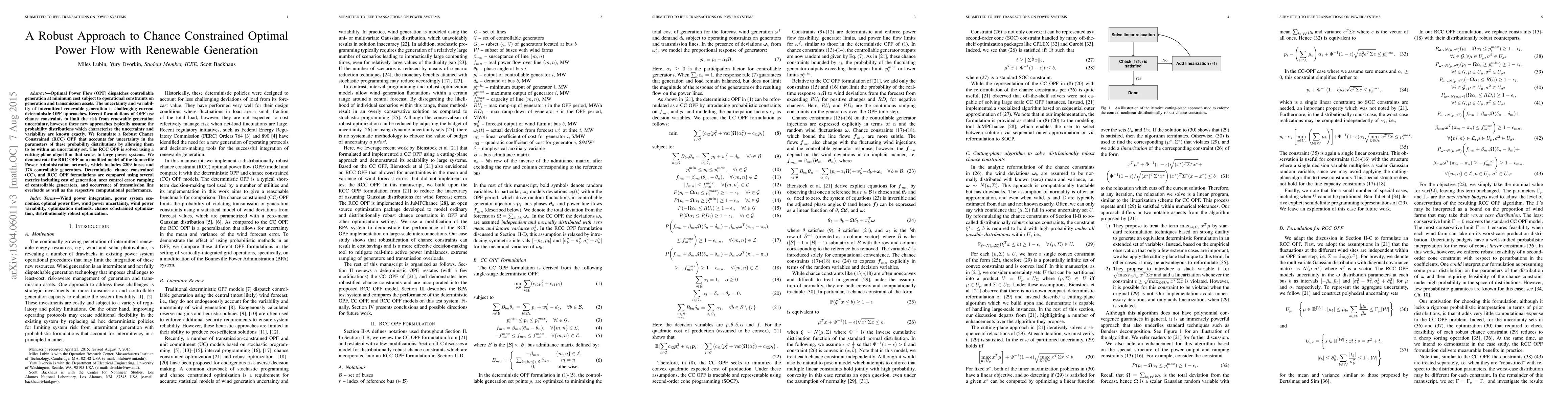 This paper proposes a Robust Chance Constrained Optimal Power Flow (RCC OPF) approach to handle uncertainty in renewable generation. It compares the RCC OPF with deterministic and chance constrained OPF methods on a large-scale power system model, evaluating performance based on cost, operational metrics, and computational efficiency.