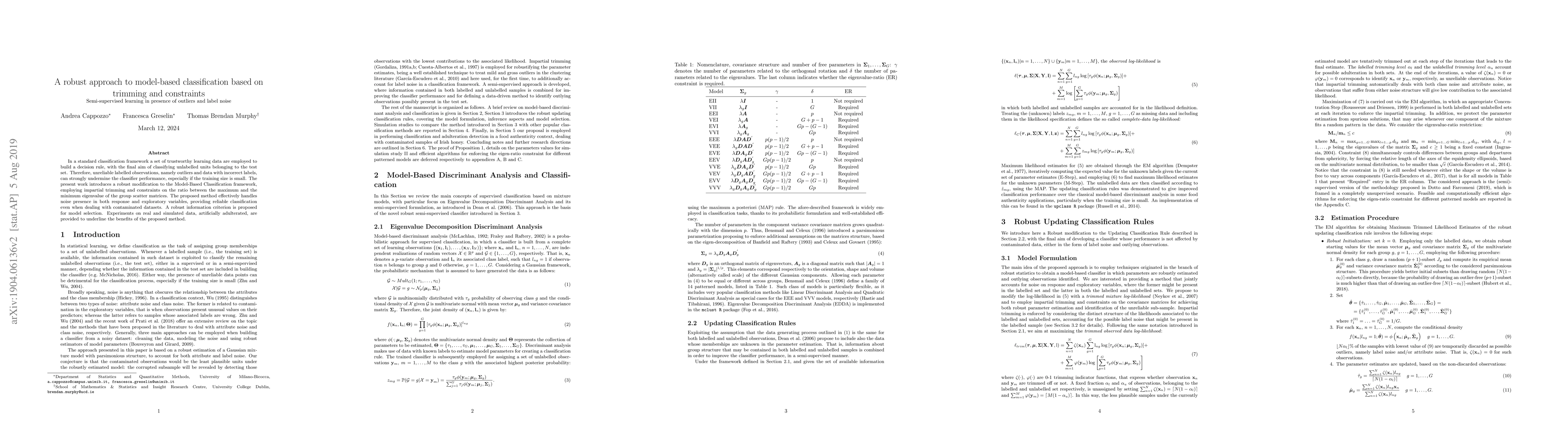This paper proposes a robust approach to model-based classification that handles noise in data, providing reliable classification even with contaminated datasets. It employs trimming and constraints on eigenvalues of group scatter matrices for accurate model selection.