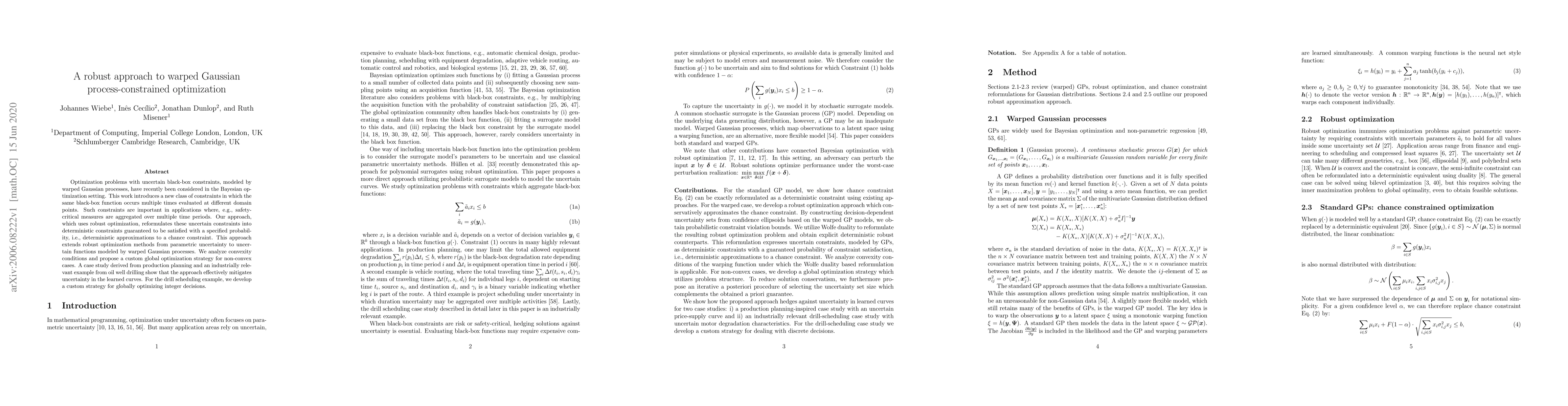 This paper proposes a robust optimization method for handling uncertain black-box constraints modeled by warped Gaussian processes, transforming them into deterministic constraints with specified probability guarantees. The approach extends robust optimization to non-convex cases and demonstrates effectiveness in production planning and oil well drilling applications.