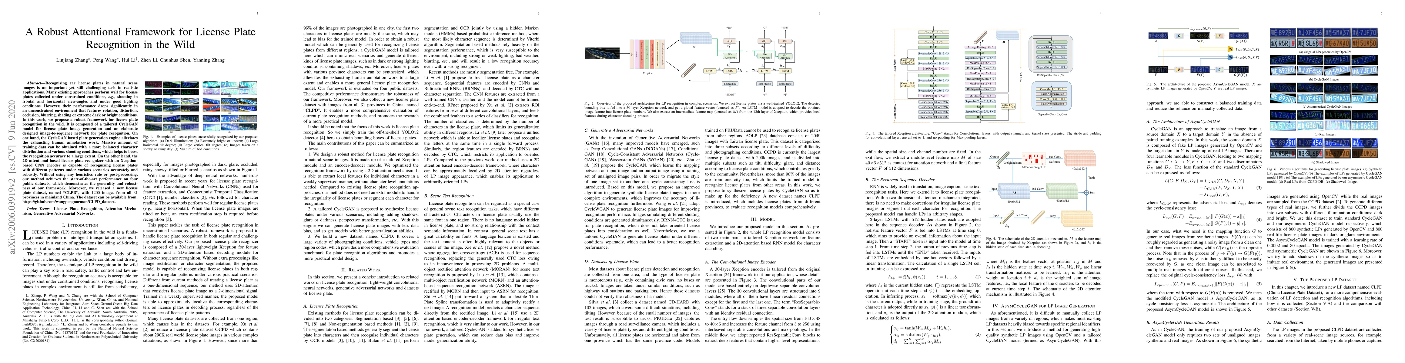 This paper proposes a robust framework for license plate recognition in unconstrained environments, utilizing a CycleGAN model for synthetic data generation and an attentional CNN-based recognizer. The method achieves state-of-the-art performance on multiple datasets, demonstrating its effectiveness and robustness.