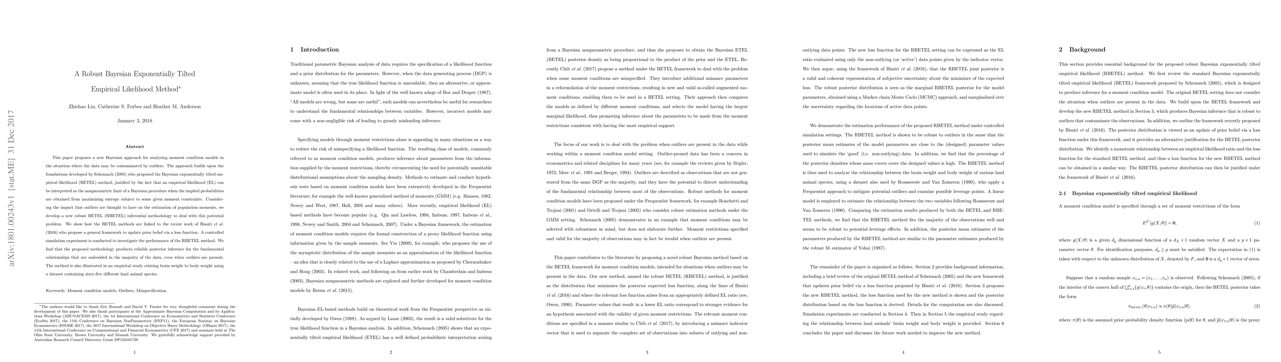 This paper introduces a robust Bayesian exponentially tilted empirical likelihood method (RBETEL) to analyze moment condition models, especially in the presence of outliers. The RBETEL method is shown to provide reliable posterior inference in simulations and is demonstrated in an empirical study on brain and body weight relationships across land animal species.