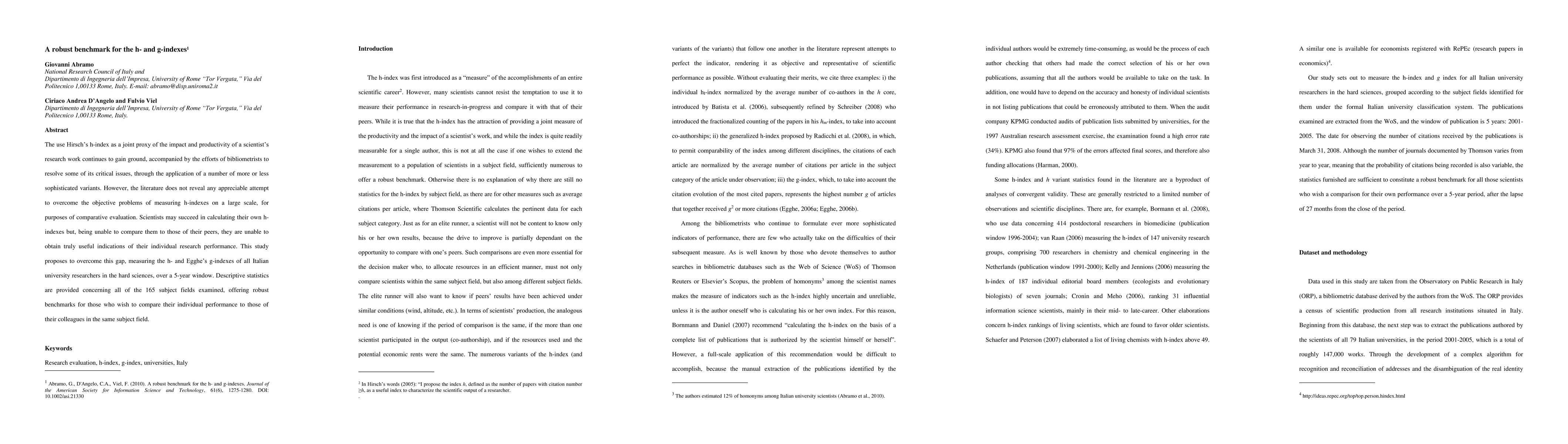 A study provides robust benchmarks for h-index and g-index measures of Italian university researchers in hard sciences, offering a comparison basis across 165 fields. This helps scientists evaluate their individual performance relative to peers in the same field.