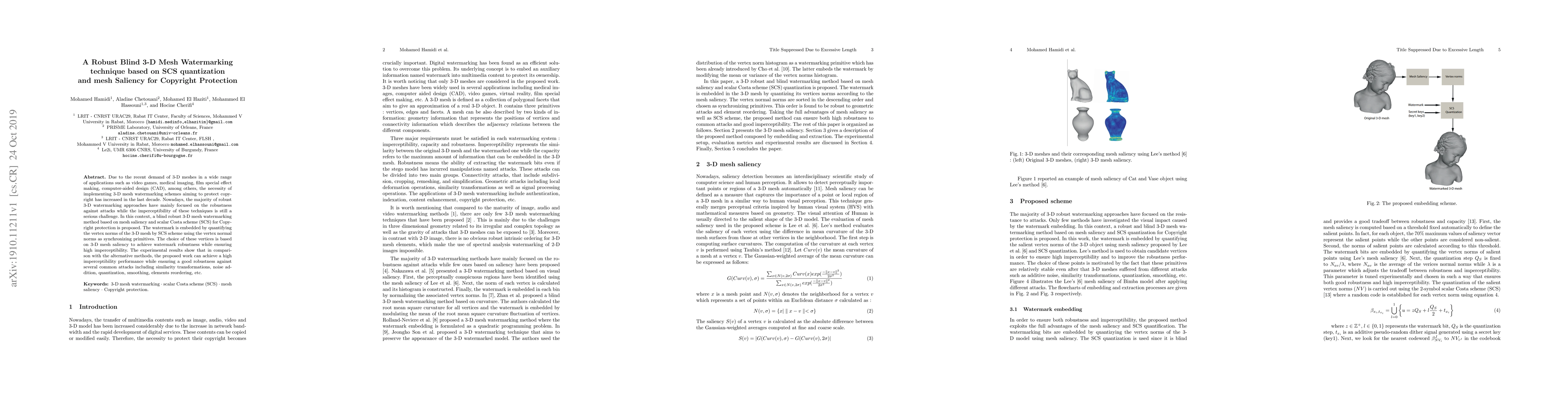 This paper proposes a robust blind 3-D mesh watermarking technique based on mesh saliency and scalar Costa scheme (SCS) quantization for copyright protection. The method achieves high imperceptibility and robustness against various attacks, outperforming alternative methods.
