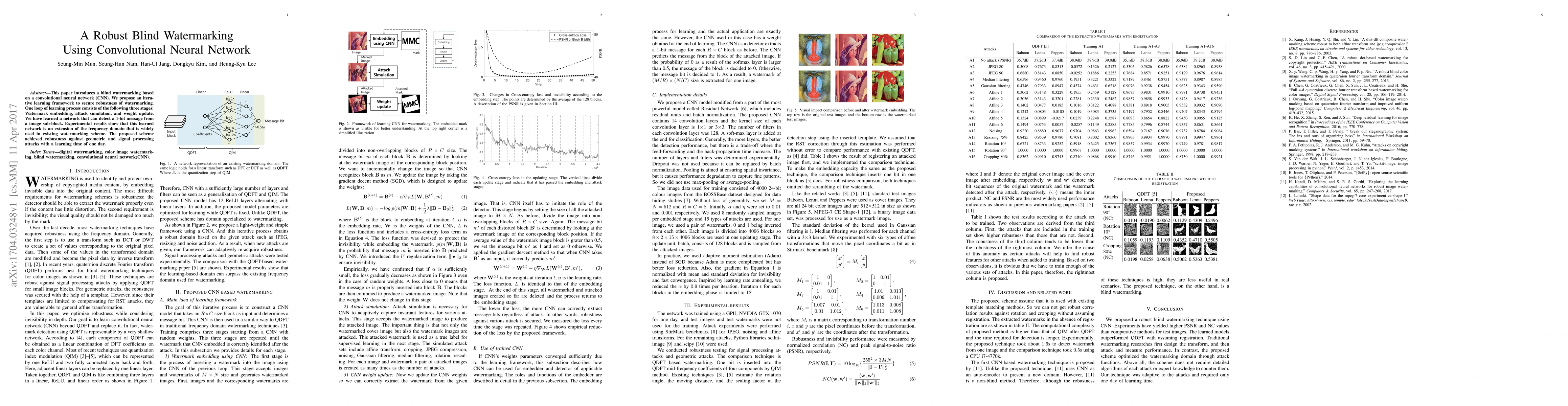 This paper proposes a robust blind watermarking technique using a convolutional neural network (CNN) that secures robustness through an iterative learning framework involving watermark embedding, attack simulation, and weight updates, demonstrating effectiveness against various attacks. Experimental results show the CNN can detect 1-bit messages and extends traditional frequency domain methods.