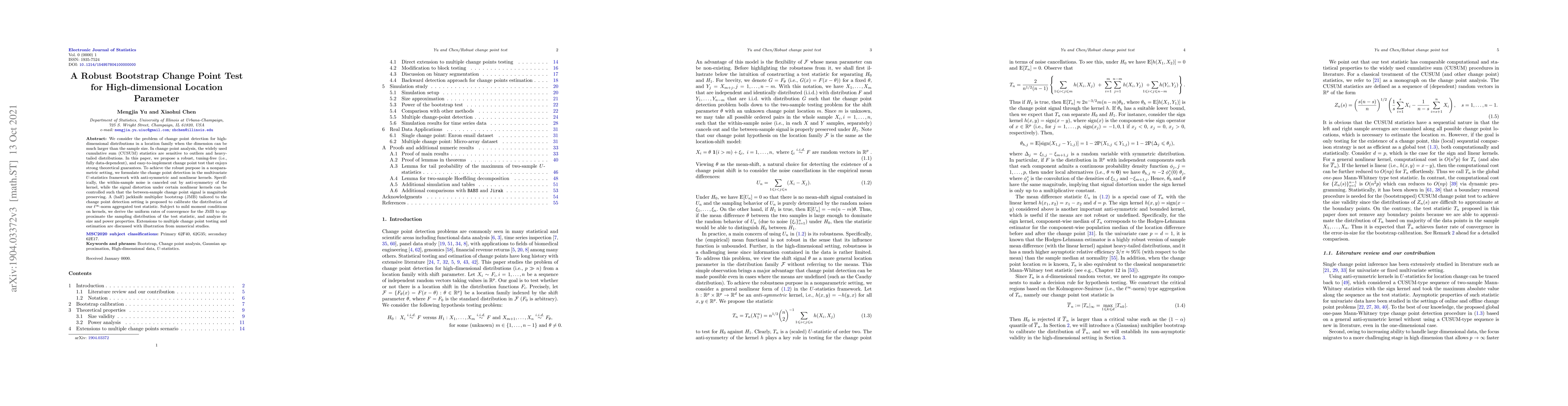 The paper proposes a robust bootstrap change point test for high-dimensional location parameters in a nonparametric setting, utilizing the multivariate U-statistics framework with anti-symmetric and nonlinear kernels. It aims to detect changes in high-dimensional distributions where the dimension can exceed the sample size, offering a tuning-free, easy-to-implement test with strong theoretical guarantees.
