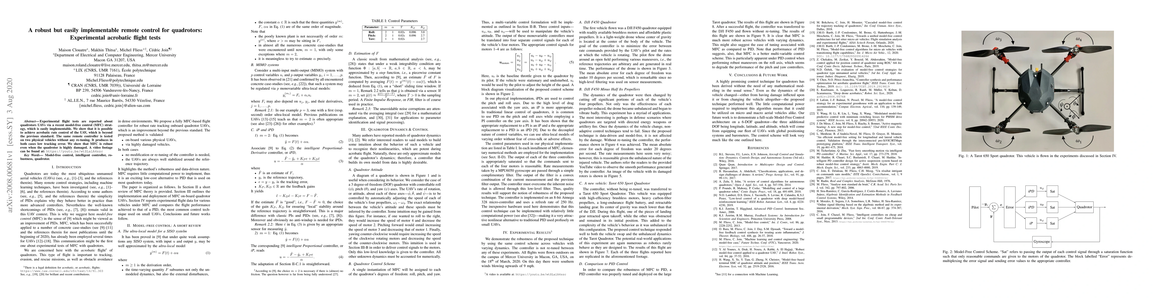 Experimental flight tests are reported about quadrotors UAVs via a recent model-free control (MFC) strategy, which is easily implementable. We show that it is possible to achieve acrobatic rate control of the UAV, which is beyond the previous standard. The same remote controller is tested on two physical vehicles without any re-tuning. It produces in both cases low tracking error. We show that MFC is robust even when the quadrotor is highly damaged. A video footage can be found at: https://youtu.be/wtSLalA4szc