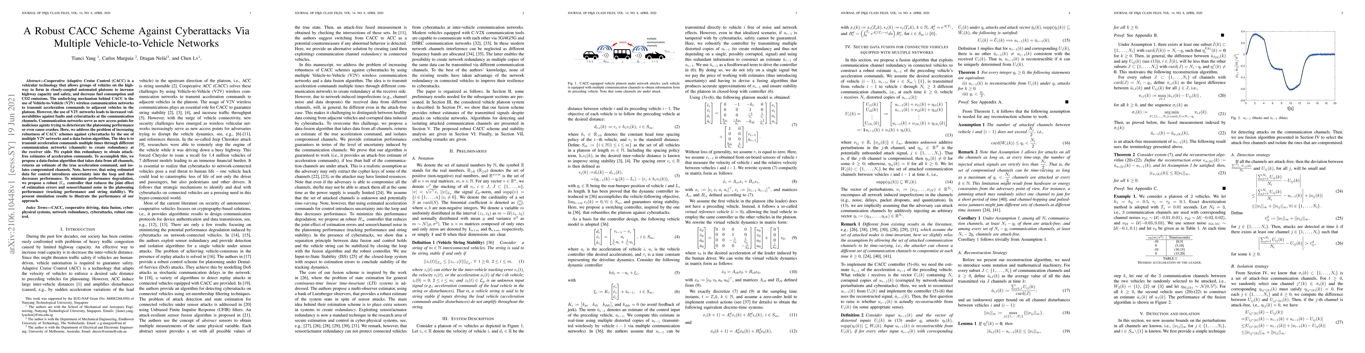 This paper proposes a robust Cooperative Adaptive Cruise Control (CACC) scheme that uses multiple Vehicle-to-Vehicle (V2V) networks and a data fusion algorithm to enhance robustness against cyberattacks. The scheme transmits acceleration commands through various channels to create redundancy, enabling the isolation of compromised channels and minimizing performance degradation with a robust $H_{\infty}$ controller.