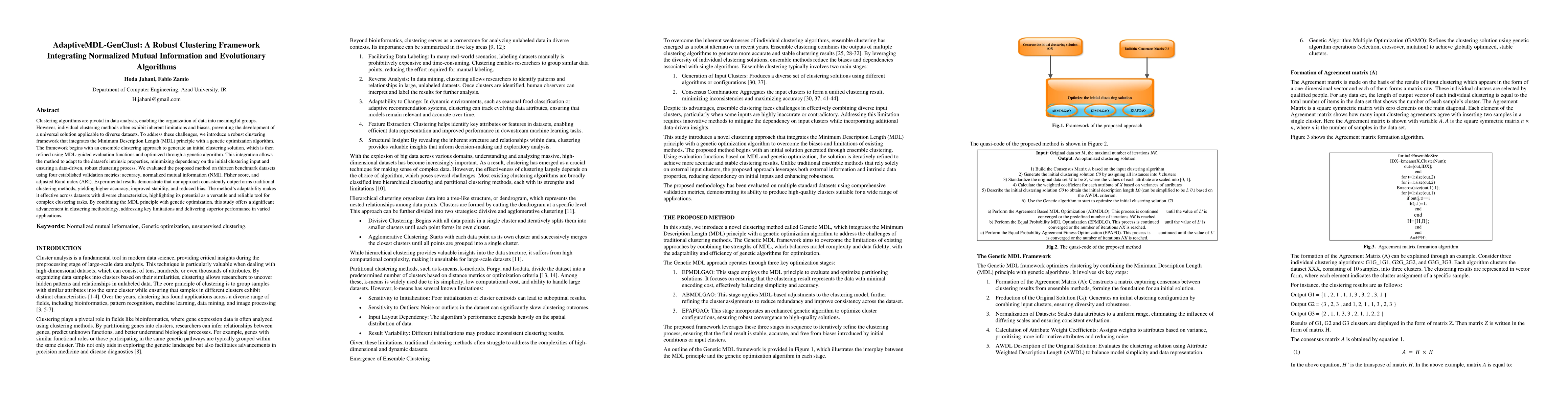 This paper proposes a novel clustering framework that combines Minimum Description Length (MDL) and genetic optimization to create a robust solution for diverse datasets. The method outperforms traditional algorithms, showing higher accuracy and adaptability, and it offers a scalable solution for various clustering applications.