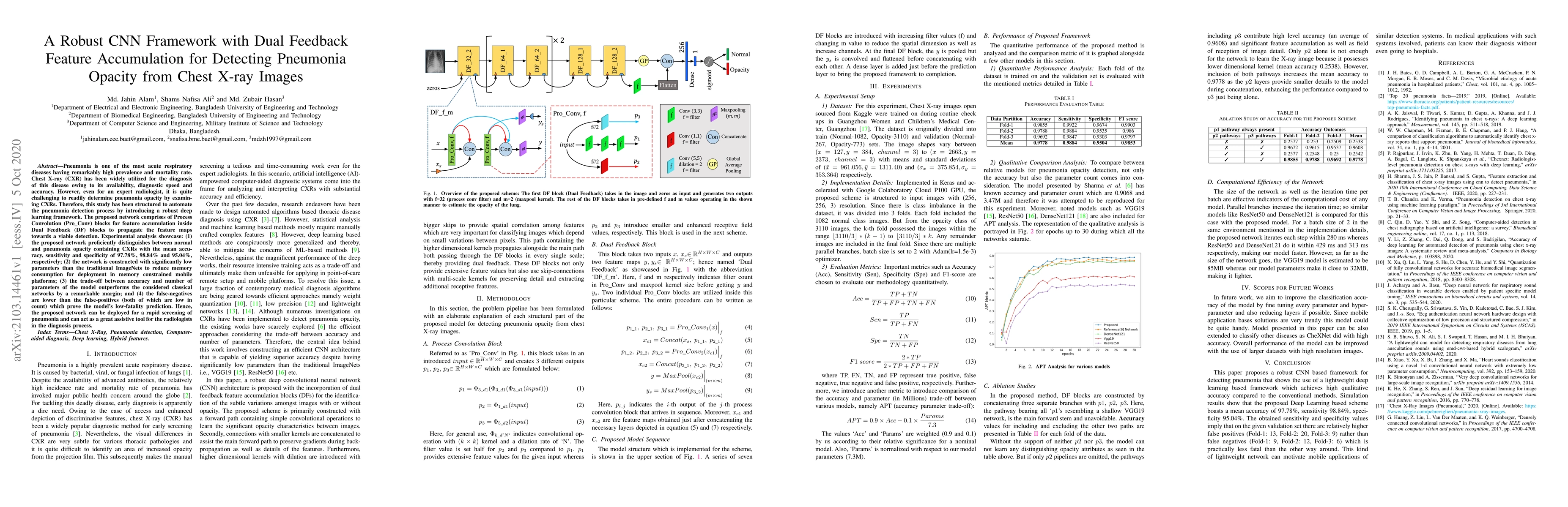 Pneumonia is one of the most acute respiratory diseases having remarkably high prevalence and mortality rate. Chest X-ray (CXR) has been widely utilized for the diagnosis of this disease owing to its availability, diagnostic speed and accuracy. However, even for an expert radiologist, it is quite challenging to readily determine pneumonia opacity by examining CXRs. Therefore, this study has been structured to automate the pneumonia detection process by introducing a robust deep learning framework. The proposed network comprises of Process Convolution (Pro_Conv) blocks for feature accumulation inside Dual Feedback (DF) blocks to propagate the feature maps towards a viable detection. Experimental analysis showcase: (1) the proposed network proficiently distinguishes between normal and pneumonia opacity containing CXRs with the mean accuracy, sensitivity and specificity of 97.78%, 98.84% and 95.04%, respectively; (2) the network is constructed with significantly low parameters than the traditional ImageNets to reduce memory consumption for deployment in memory constrained mobile platforms; (3) the trade-off between accuracy and number of parameters of the model outperforms the considered classical networks by a remarkable margin; and (4) the false-negatives are lower than the false-positives (both of which are low in count) which prove the model's low-fatality prediction. Hence, the proposed network can be deployed for a rapid screening of pneumonia and can act as a great assistive tool for the radiologists in the diagnosis process.