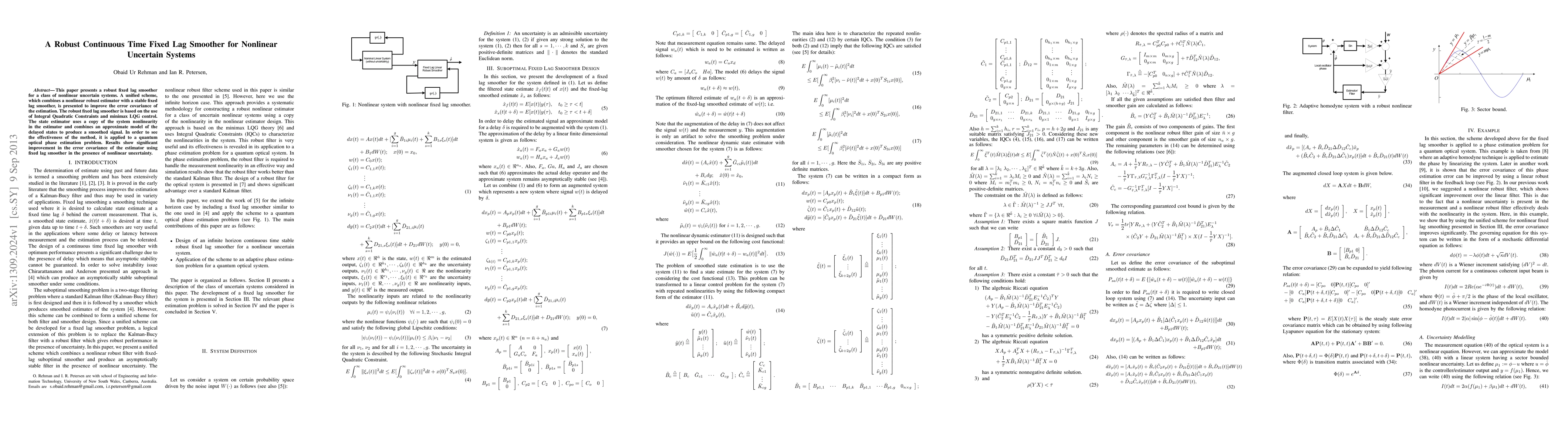 This paper presents a robust fixed lag smoother for a class of nonlinear uncertain systems. A unified scheme, which combines a nonlinear robust estimator with a stable fixed lag smoother, is presented to improve the error covariance of the estimation. The robust fixed lag smoother is based on the use of Integral Quadratic Constraints and minimax LQG control. The state estimator uses a copy of the system nonlinearity in the estimator and combines an approximate model of the delayed states to produce a smoothed signal. In order to see the effectiveness of the method, it is applied to a quantum optical phase estimation problem. Results show significant improvement in the error covariance of the estimator using fixed lag smoother in the presence of nonlinear uncertainty.