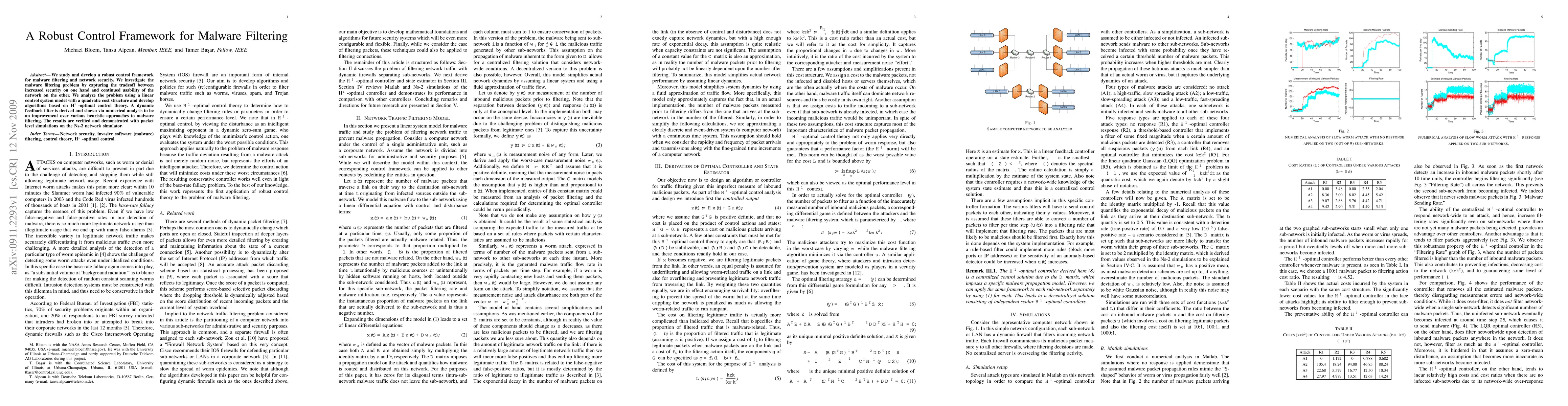 We study and develop a robust control framework for malware filtering and network security. We investigate the malware filtering problem by capturing the tradeoff between increased security on one hand and continued usability of the network on the other. We analyze the problem using a linear control system model with a quadratic cost structure and develop algorithms based on H infinity-optimal control theory. A dynamic feedback filter is derived and shown via numerical analysis to be an improvement over various heuristic approaches to malware filtering. The results are verified and demonstrated with packet level simulations on the Ns-2 network simulator.