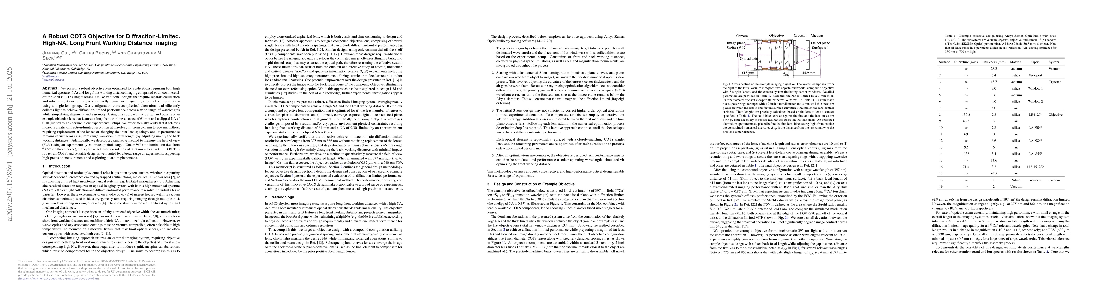 We present a robust objective lens optimized for applications requiring both high numerical aperture (NA) and long front working distance imaging comprised of all commercial-off-the-shelf (COTS) singlet lenses. Unlike traditional designs that require separate collimation and refocusing stages, our approach directly converges imaged light to the back focal plane using a single lens group. Our configuration corrects spherical aberrations and efficiently collects light to achieve diffraction-limited performance across a wide range of wavelengths while simplifying alignment and assembly. Using this approach, we design and construct an example objective lens that features a long front working distance of 61 mm and a clipped NA of 0.30 (limited by an aperture in our experimental setup). We experimentally verify that it achieves monochromatic diffraction-limited resolution at wavelengths from 375 nm to 866 nm without requiring replacement of the lenses or changing the inter-lens spacings, and its performance remains robust across a 46 mm range variation in total length (by adjusting mainly the back working distances). Additionally, we develop a quantitative method to measure the field of view (FOV) using an experimentally-calibrated pinhole target. Under 397 nm illumination (i.e. from $^{40}$Ca$^+$ ion fluorescence), the objective achieves a resolution of 0.87 $\mu$m with a 540 $\mu$m FOV. This robust, all-COTS, and versatile design is well-suited for a broad range of experiments, supporting high-precision measurements and exploring quantum phenomena.