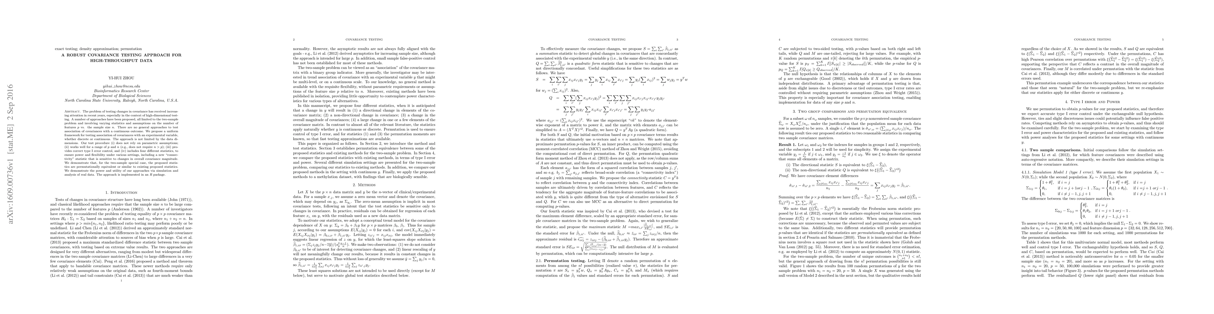The problem of testing changes in covariance has received increasing attention in recent years, especially in the context of high-dimensional testing. A number of approaches have been proposed, all limited to the two-sample problem and involving varying statistics and assumptions on the number of features $p$ vs. the sample size $n$. There are no general approaches to test association of covariances with a continuous outcome. We propose a uniform framework for testing association of covariances with an experimental variable, whether discrete or continuous. The approach is not limited by the data dimensions. Our test procedure (i) does not rely on parametric assumptions, (ii) works well for a range of $p$ and $n$ (e.g., does not require $n > p$), (iii) provides correct type I error control, and (iv) includes four different statistics, to ensure power and flexibility under various settings, including a new "connectivity" statistic that is sensitive to changes in overall covariance magnitude. We demonstrate that, for the two-sample special case, the proposed statistics are permutationally equivalent or similar to existing proposed statistics. We demonstrate the power and utility of our approaches via simulation and analysis of real data. The approach is implemented in an $R$ package.