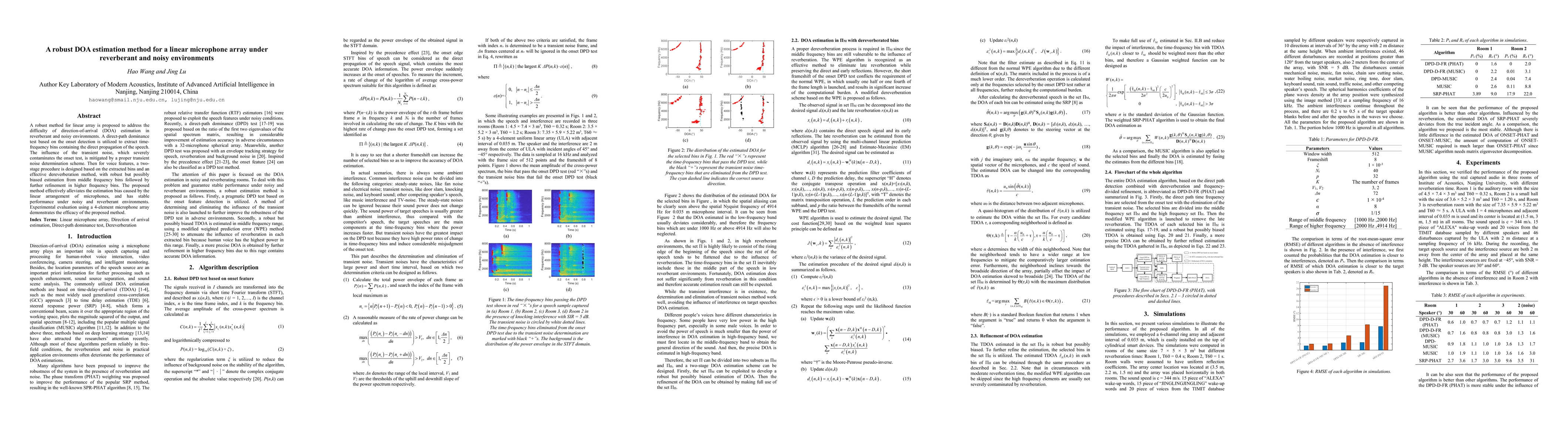 This paper proposes a robust DOA estimation method for a linear microphone array in reverberant and noisy environments, utilizing a direct-path dominance test and transient noise determination to extract direct speech propagation. A two-stage voice feature extraction and dereverberation procedure enhances estimation accuracy, showing stable performance in experimental evaluations.
