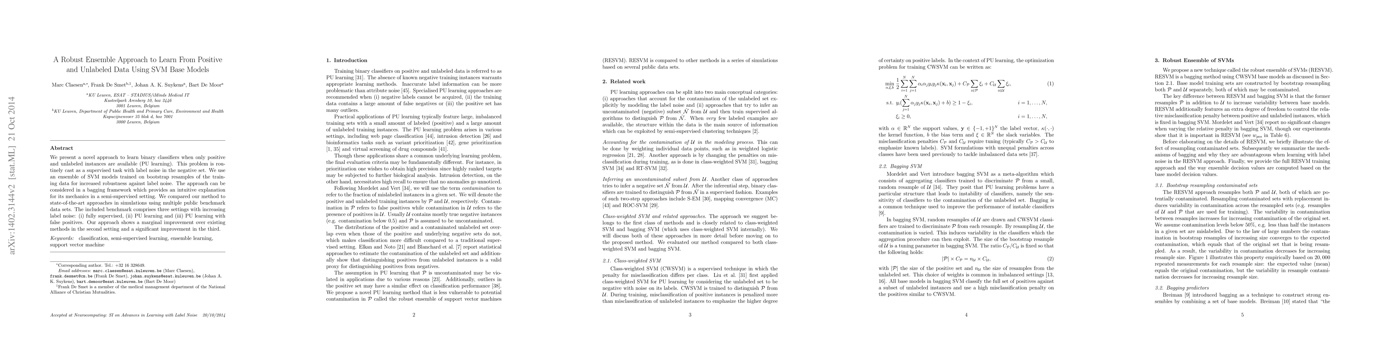 We present a novel approach to learn binary classifiers when only positive and unlabeled instances are available (PU learning). This problem is routinely cast as a supervised task with label noise in the negative set. We use an ensemble of SVM models trained on bootstrap resamples of the training data for increased robustness against label noise. The approach can be considered in a bagging framework which provides an intuitive explanation for its mechanics in a semi-supervised setting. We compared our method to state-of-the-art approaches in simulations using multiple public benchmark data sets. The included benchmark comprises three settings with increasing label noise: (i) fully supervised, (ii) PU learning and (iii) PU learning with false positives. Our approach shows a marginal improvement over existing methods in the second setting and a significant improvement in the third.