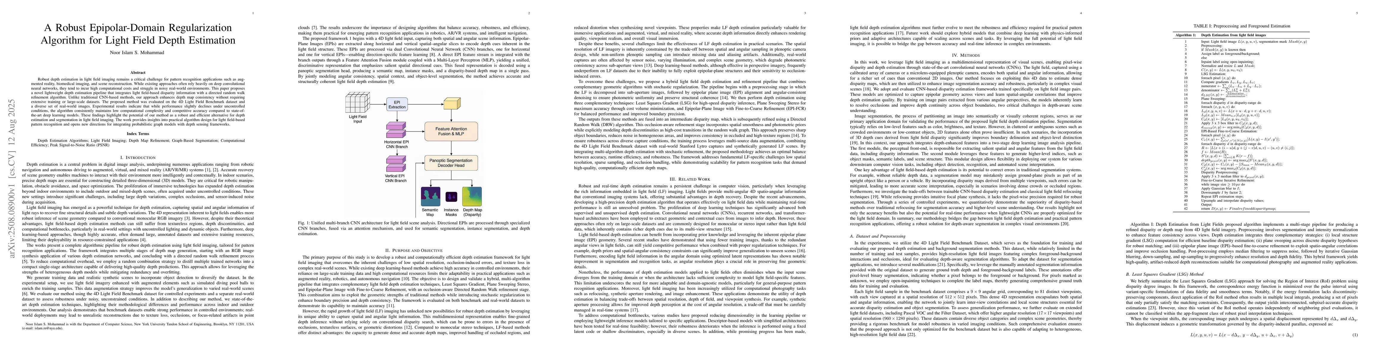 Robust depth estimation in light field imaging remains a critical challenge for pattern recognition applications such as augmented reality, biomedical imaging, and scene reconstruction. While existing approaches often rely heavily on deep convolutional neural networks, they tend to incur high computational costs and struggle in noisy real-world environments. This paper proposes a novel lightweight depth estimation pipeline that integrates light field-based disparity information with a directed random walk refinement algorithm. Unlike traditional CNN-based methods, our approach enhances depth map consistency without requiring extensive training or large-scale datasets. The proposed method was evaluated on the 4D Light Field Benchmark dataset and a diverse set of real-world images. Experimental results indicate that while performance slightly declines under uncontrolled conditions, the algorithm consistently maintains low computational complexity and competitive accuracy compared to state-of-the-art deep learning models. These findings highlight the potential of our method as a robust and efficient alternative for depth estimation and segmentation in light field imaging. The work provides insights into practical algorithm design for light field-based pattern recognition and opens new directions for integrating probabilistic graph models with depth sensing frameworks.