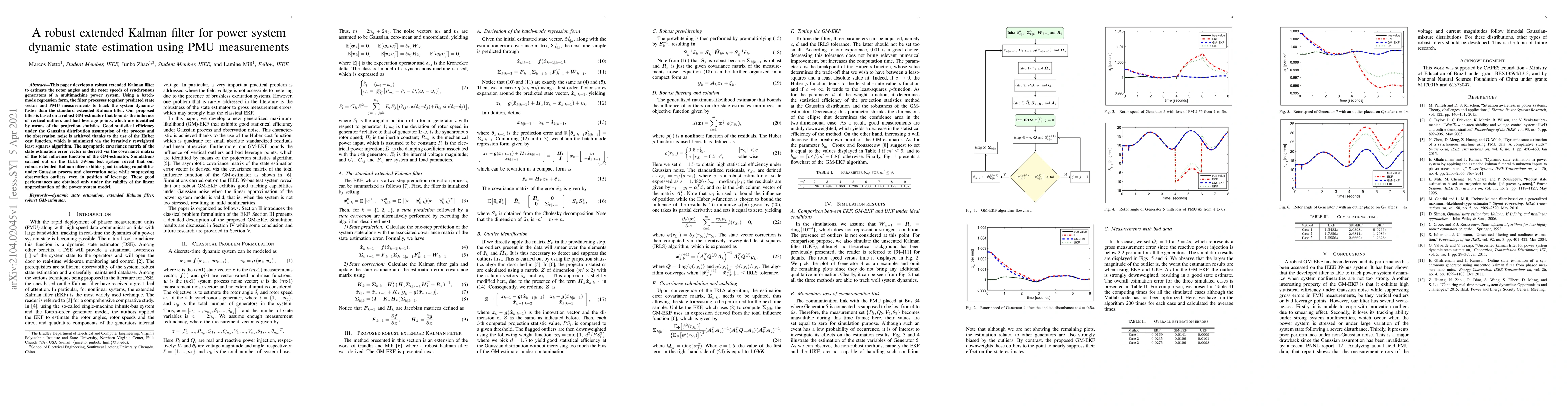 This paper proposes a robust extended Kalman filter using PMU measurements to estimate rotor angles and speeds in power systems, achieving better tracking and outlier suppression through a GM-estimator and Huber cost function. Simulation results on the IEEE 39-bus system show improved performance under Gaussian noise conditions.