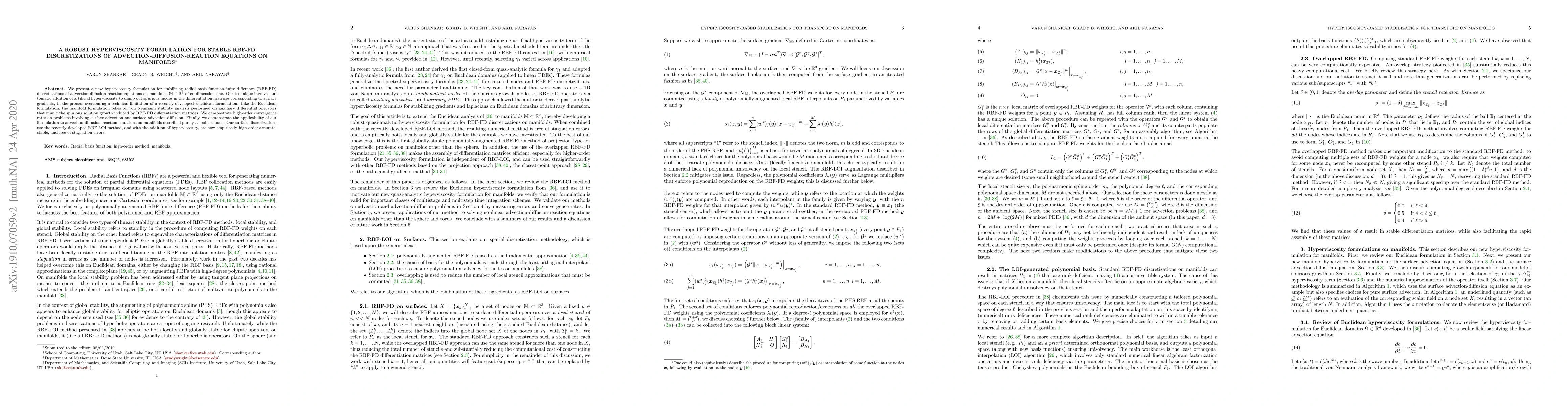 This paper introduces a new hyperviscosity technique to stabilize radial basis function-finite difference (RBF-FD) discretizations for advection-diffusion-reaction equations on co-dimension one manifolds. The method effectively dampens spurious modes and achieves high-order accuracy, stability, and absence of stagnation errors.