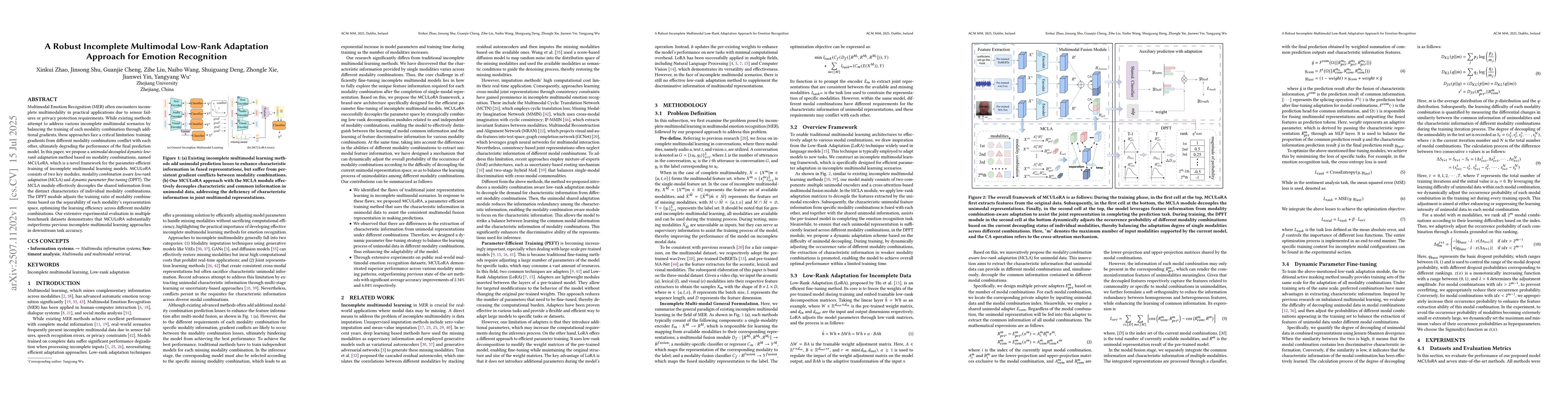 Multimodal Emotion Recognition (MER) often encounters incomplete multimodality in practical applications due to sensor failures or privacy protection requirements. While existing methods attempt to address various incomplete multimodal scenarios by balancing the training of each modality combination through additional gradients, these approaches face a critical limitation: training gradients from different modality combinations conflict with each other, ultimately degrading the performance of the final prediction model. In this paper, we propose a unimodal decoupled dynamic low-rank adaptation method based on modality combinations, named MCULoRA, which is a novel framework for the parameter-efficient training of incomplete multimodal learning models. MCULoRA consists of two key modules, modality combination aware low-rank adaptation (MCLA) and dynamic parameter fine-tuning (DPFT). The MCLA module effectively decouples the shared information from the distinct characteristics of individual modality combinations. The DPFT module adjusts the training ratio of modality combinations based on the separability of each modality's representation space, optimizing the learning efficiency across different modality combinations. Our extensive experimental evaluation in multiple benchmark datasets demonstrates that MCULoRA substantially outperforms previous incomplete multimodal learning approaches in downstream task accuracy.
