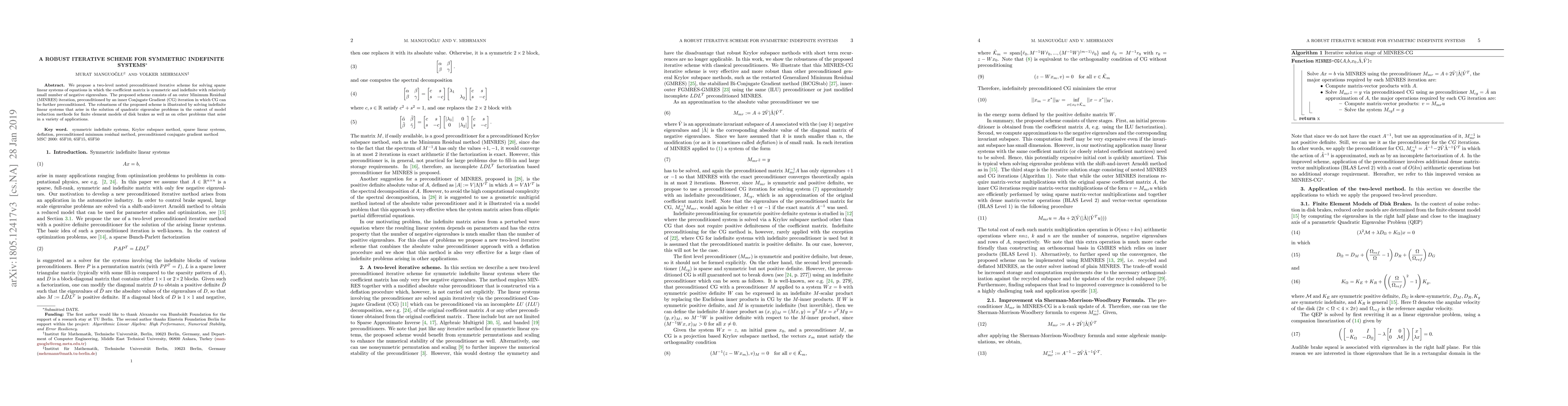We propose a two-level nested preconditioned iterative scheme for solving sparse linear systems of equations in which the coefficient matrix is symmetric and indefinite with relatively small number of negative eigenvalues. The proposed scheme consists of an outer Minimum Residual (MINRES) iteration, preconditioned by an inner Conjugate Gradient (CG) iteration in which CG can be further preconditioned. The robustness of the proposed scheme is illustrated by solving indefinite linear systems that arise in the solution of quadratic eigenvalue problems in the context of model reduction methods for finite element models of disk brakes as well as on other problems that arise in a variety of applications.