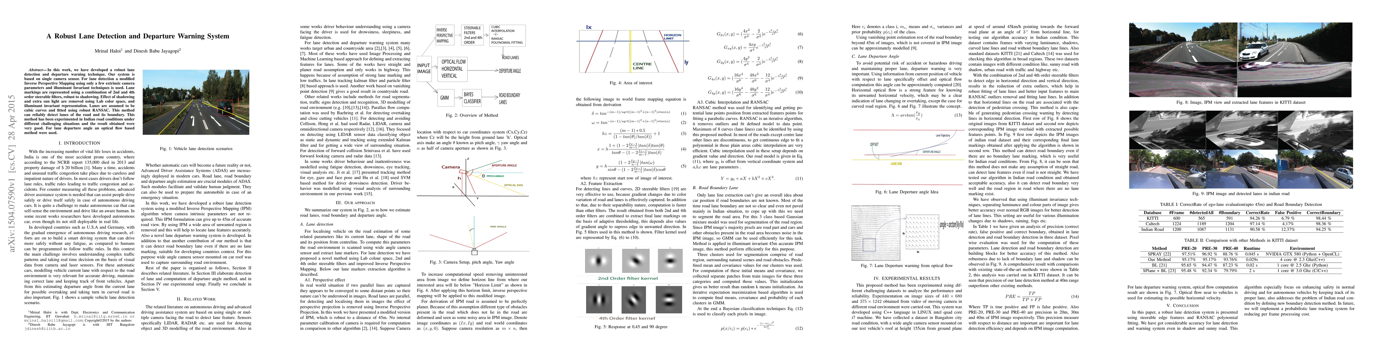 This research presents a robust lane detection and departure warning system using a single camera, employing modified Inverse Perspective Mapping and illuminant invariant techniques to detect lane markings. An optical flow method is used for lane departure warning, tested successfully under varied Indian road conditions.