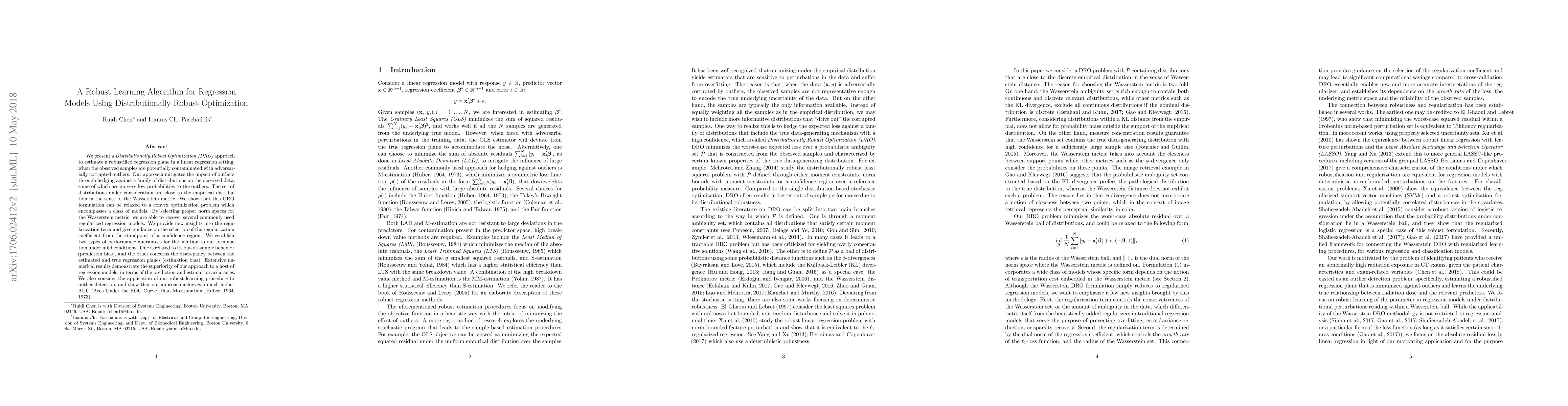 This paper proposes a robust learning algorithm for regression models using Distributionally Robust Optimization under the Wasserstein metric to mitigate the impact of adversarially corrupted outliers. The approach formulates a convex optimization problem and provides performance guarantees, demonstrating superior prediction and estimation accuracy compared to other regression models.