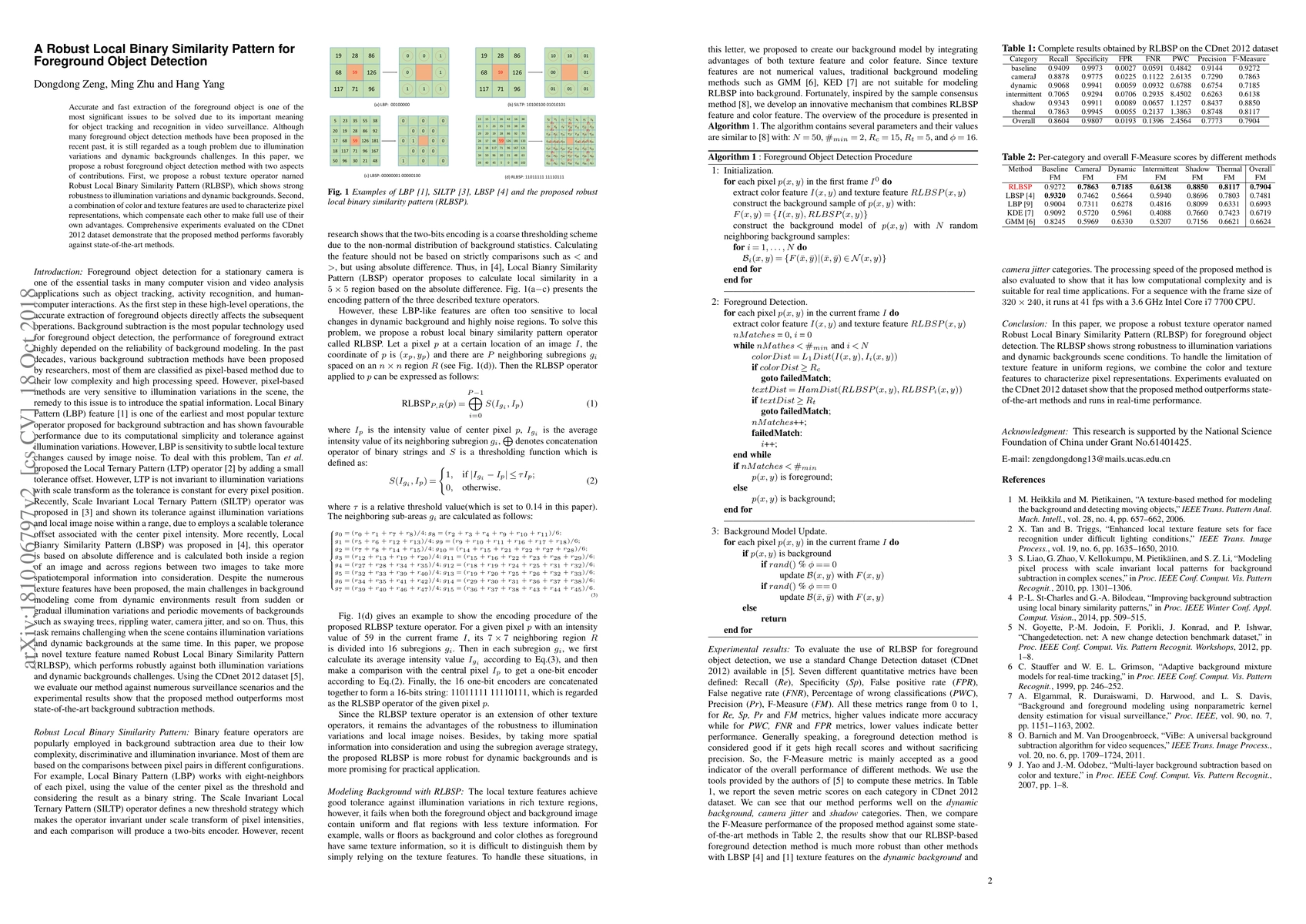 Accurate and fast extraction of the foreground object is one of the most significant issues to be solved due to its important meaning for object tracking and recognition in video surveillance. Although many foreground object detection methods have been proposed in the recent past, it is still regarded as a tough problem due to illumination variations and dynamic backgrounds challenges. In this paper, we propose a robust foreground object detection method with two aspects of contributions. First, we propose a robust texture operator named Robust Local Binary Similarity Pattern (RLBSP), which shows strong robustness to illumination variations and dynamic backgrounds. Second, a combination of color and texture features are used to characterize pixel representations, which compensate each other to make full use of their own advantages. Comprehensive experiments evaluated on the CDnet 2012 dataset demonstrate that the proposed method performs favorably against state-of-the-art methods.