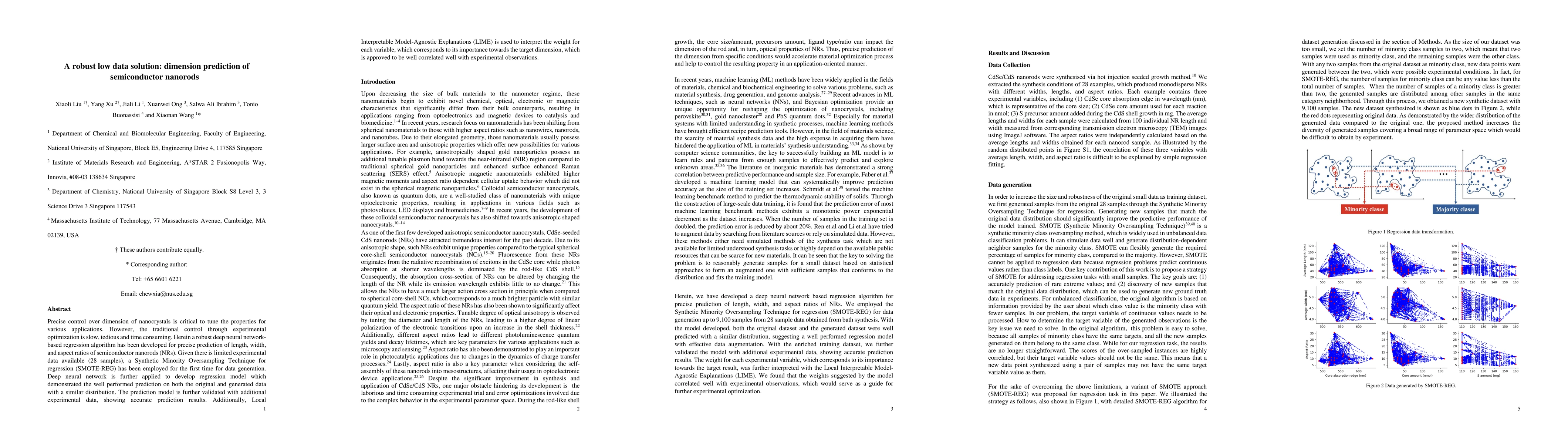 Precise control over dimension of nanocrystals is critical to tune the properties for various applications. However, the traditional control through experimental optimization is slow, tedious and time consuming. Herein a robust deep neural network-based regression algorithm has been developed for precise prediction of length, width, and aspect ratios of semiconductor nanorods (NRs). Given there is limited experimental data available (28 samples), a Synthetic Minority Oversampling Technique for regression (SMOTE-REG) has been employed for the first time for data generation. Deep neural network is further applied to develop regression model which demonstrated the well performed prediction on both the original and generated data with a similar distribution. The prediction model is further validated with additional experimental data, showing accurate prediction results. Additionally, Local Interpretable Model-Agnostic Explanations (LIME) is used to interpret the weight for each variable, which corresponds to its importance towards the target dimension, which is approved to be well correlated well with experimental observations.
