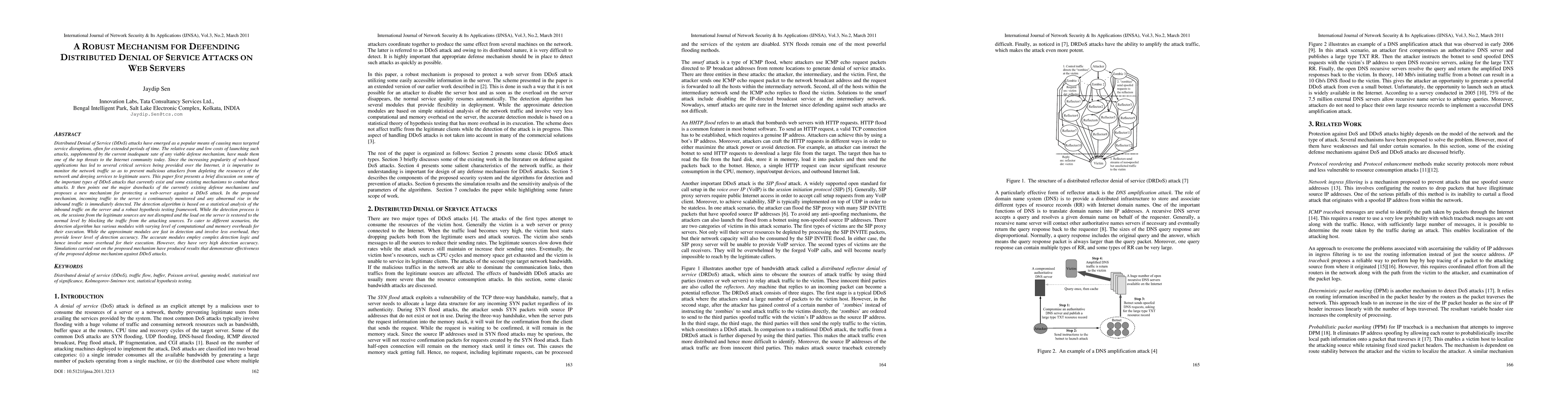 This paper discusses various types of DDoS attacks and their current defense mechanisms, highlighting their limitations. It proposes a robust defense mechanism based on statistical analysis and hypothesis testing to monitor and detect abnormal traffic rises, effectively protecting web servers from DDoS attacks.