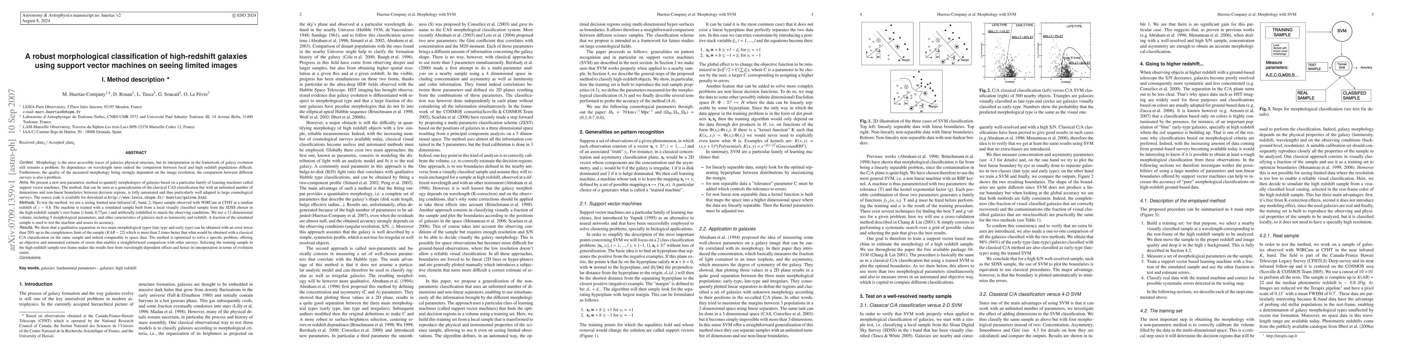 We present a new non-parametric method to quantify morphologies of galaxies based on a particular family of learning machines called support vector machines. The method, that can be seen as a generalization of the classical CAS classification but with an unlimited number of dimensions and non-linear boundaries between decision regions, is fully automated and thus particularly well adapted to large cosmological surveys. The source code is available for download at http://www.lesia.obspm.fr/~huertas/galsvm.html To test the method, we use a seeing limited near-infrared ($K_s$ band, $2,16\mu m$) sample observed with WIRCam at CFHT at a median redshift of $z\sim0.8$. The machine is trained with a simulated sample built from a local visually classified sample from the SDSS chosen in the high-redshift sample's rest-frame (i band, $0.77\mu m$) and artificially redshifted to match the observing conditions. We use a 12-dimensional volume, including 5 morphological parameters and other caracteristics of galaxies such as luminosity and redshift. We show that a qualitative separation in two main morphological types (late type and early type) can be obtained with an error lower than 20% up to the completeness limit of the sample ($KAB\sim 22$) which is more than 2 times better that what would be obtained with a classical C/A classification on the same sample and indeed comparable to space data. The method is optimized to solve a specific problem, offering an objective and automated estimate of errors that enables a straightforward comparison with other surveys.