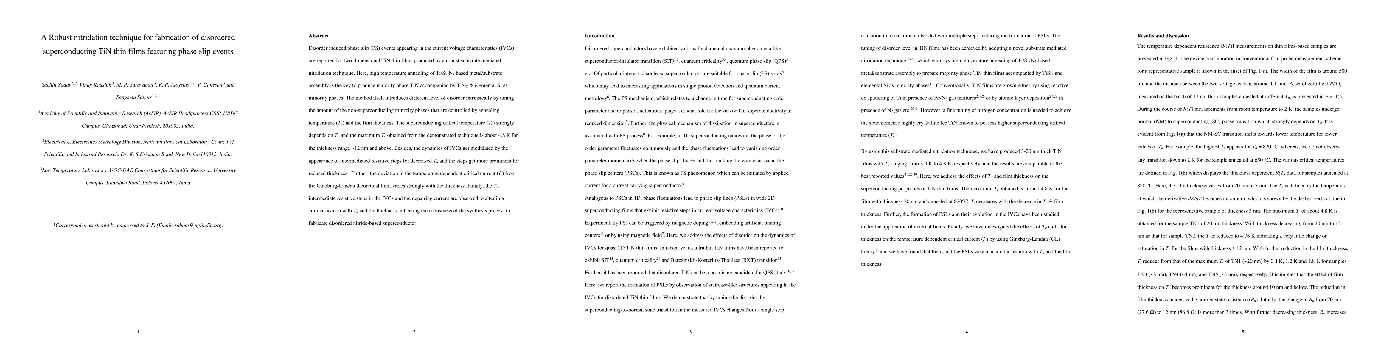 This paper reports on a robust nitridation technique to fabricate disordered superconducting TiN thin films, showing phase slip events in their current-voltage characteristics. The method, involving high-temperature annealing of Ti/Si3N4 assemblies, produces TiN with minority phases, and the superconducting critical temperature (Tc) varies with annealing temperature and film thickness, reaching up to 4.8 K for films above 12 nm.