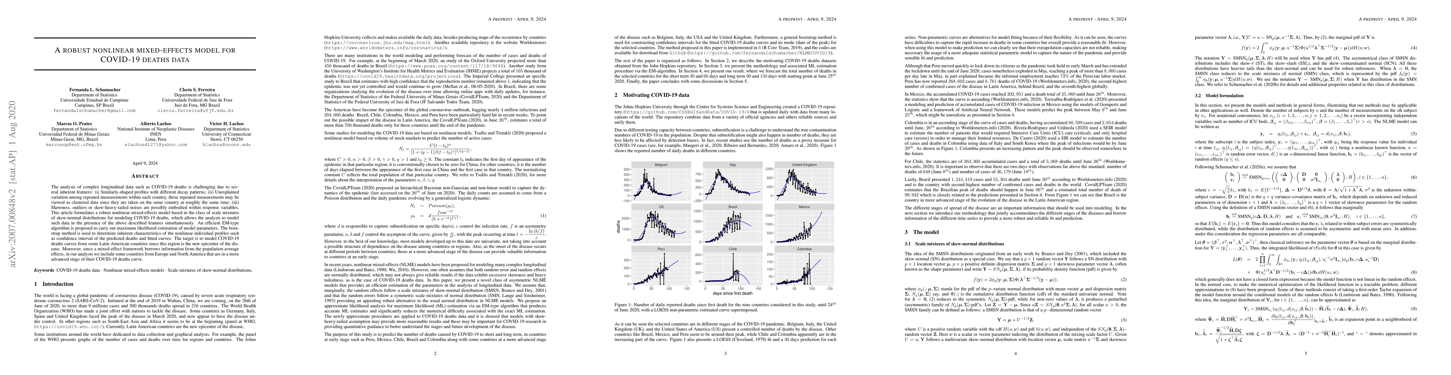 The analysis of complex longitudinal data such as COVID-19 deaths is challenging due to several inherent features: (i) Similarly-shaped profiles with different decay patterns; (ii) Unexplained variation among repeated measurements within each country, these repeated measurements may be viewed as clustered data since they are taken on the same country at roughly the same time; (iii) Skewness, outliers or skew-heavy-tailed noises are possibly embodied within response variables. This article formulates a robust nonlinear mixed-effects model based in the class of scale mixtures of skew-normal distributions for modeling COVID-19 deaths, which allows the analysts to model such data in the presence of the above described features simultaneously. An efficient EM-type algorithm is proposed to carry out maximum likelihood estimation of model parameters. The bootstrap method is used to determine inherent characteristics of the nonlinear individual profiles such as confidence interval of the predicted deaths and fitted curves. The target is to model COVID-19 deaths curves from some Latin American countries since this region is the new epicenter of the disease. Moreover, since a mixed-effect framework borrows information from the population-average effects, in our analysis we include some countries from Europe and North America that are in a more advanced stage of their COVID-19 deaths curve.