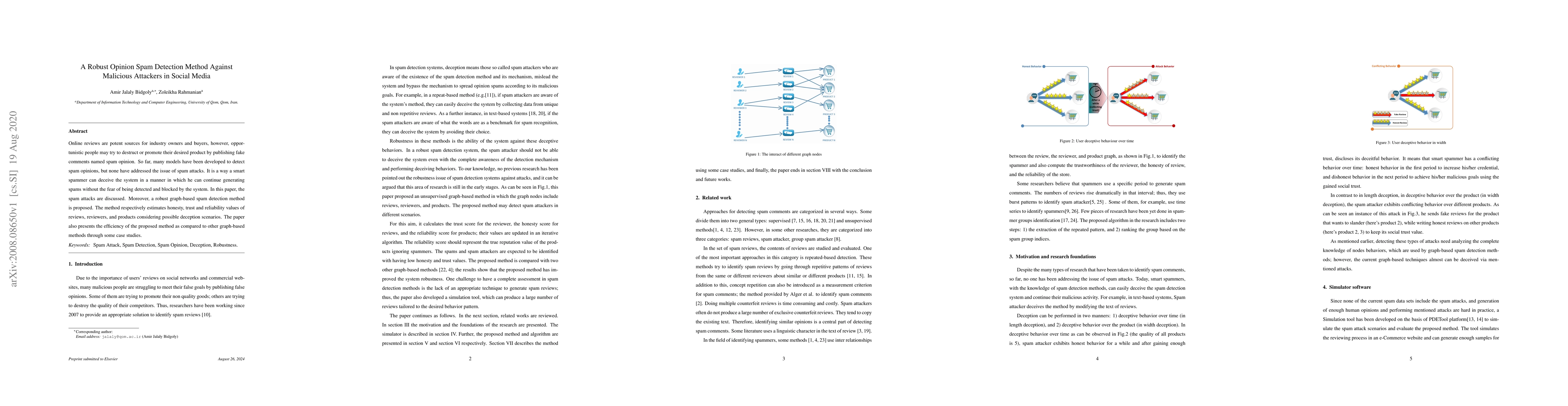 Online reviews are potent sources for industry owners and buyers, however opportunistic people may try to destruct or promote their desired product by publishing fake comments named spam opinion. So far, many models have been developed to detect spam opinions, but none have addressed the issue of spam attack. It is a way a smart spammer can deceive the system in a manner in which he can continue generating spams without the fear of being detected and blocked by the system. In this paper, the spam attacks are discussed. Moreover, a robust graph-based spam detection method is proposed. The method respectively estimates honesty, trust and reliability values of reviews, reviewers, and products considering possible deception scenarios. The paper also presents the efficiency of the proposed method as compared to other graph-based methods through some case studies.