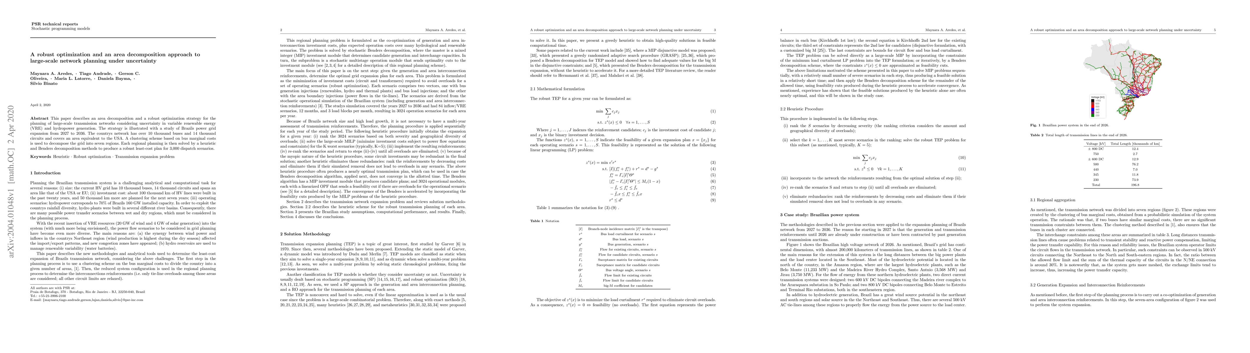 This paper proposes an area decomposition and robust optimization strategy for large-scale network planning under uncertainty, specifically for Brazil's extensive power grid. It employs a clustering scheme to divide the grid into seven regions, each planned using heuristic and Benders decomposition methods to handle 3,000 dispatch scenarios.