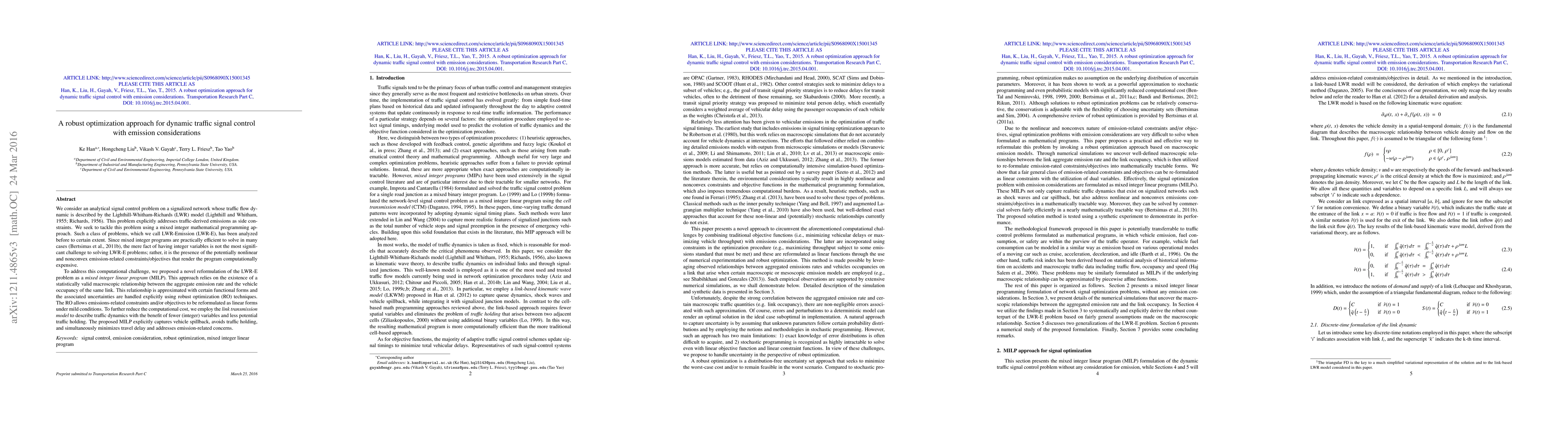 The paper presents a robust optimization approach for dynamic traffic signal control, considering emissions. It reformulates the non-linear, non-convex LWR-Emission problem into a mixed integer linear program (MILP) using robust optimization techniques. This method reduces computational cost and explicitly handles emission uncertainties, capturing vehicle spillback and minimizing travel delay while addressing emission concerns.